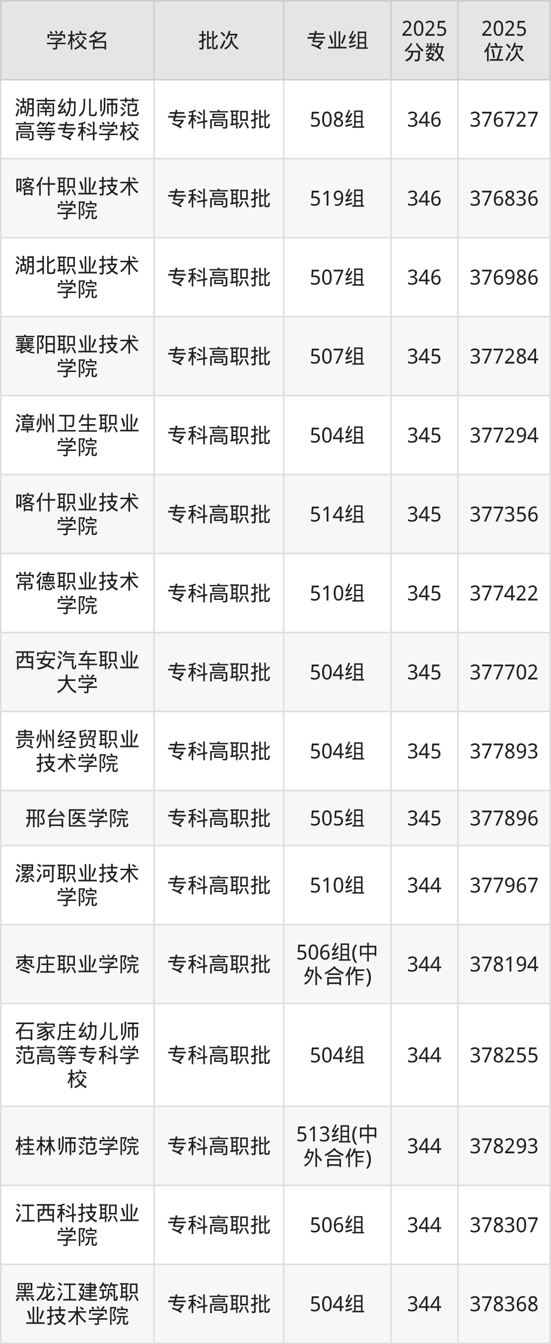 2025年广东高考物理类345分(377179名~377940名)能上的大学有邢台医学院505组、襄阳职业技术学院507组、常德职业技术学院510组、西安汽车职业大学504组等。