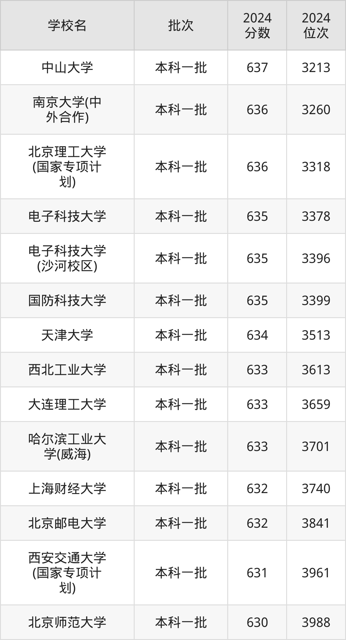 2024年陕西高考理科633分(3606名~3729名)能上的大学有大连理工大学、哈尔滨工业大学(威海)、西北工业大学。