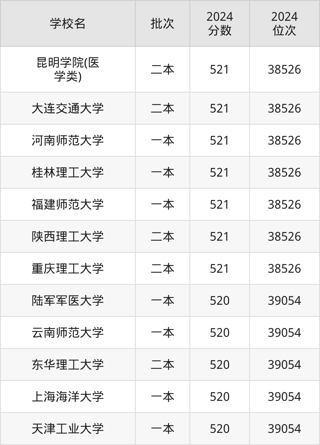 2024年云南高考理科520分(38527名~39054名)能上的大学有陆军军医大学、上海海洋大学、天津工业大学、云南师范大学等。
