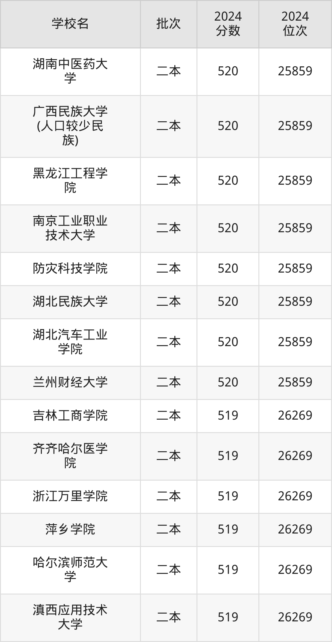 2024年云南高考文科520分(25422名~25859名)能上的大学有黑龙江工程学院、湖南中医药大学、湖南科技学院、南京工业职业技术大学等。