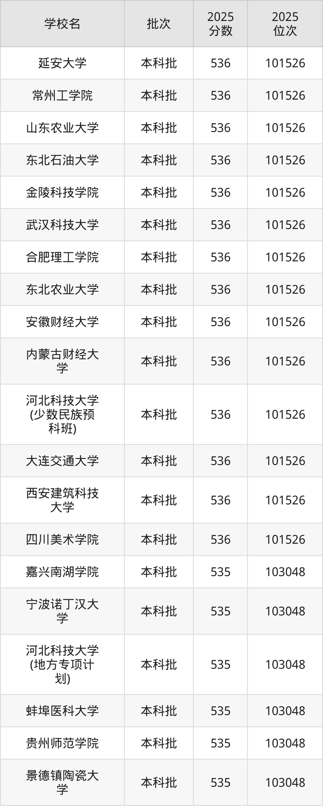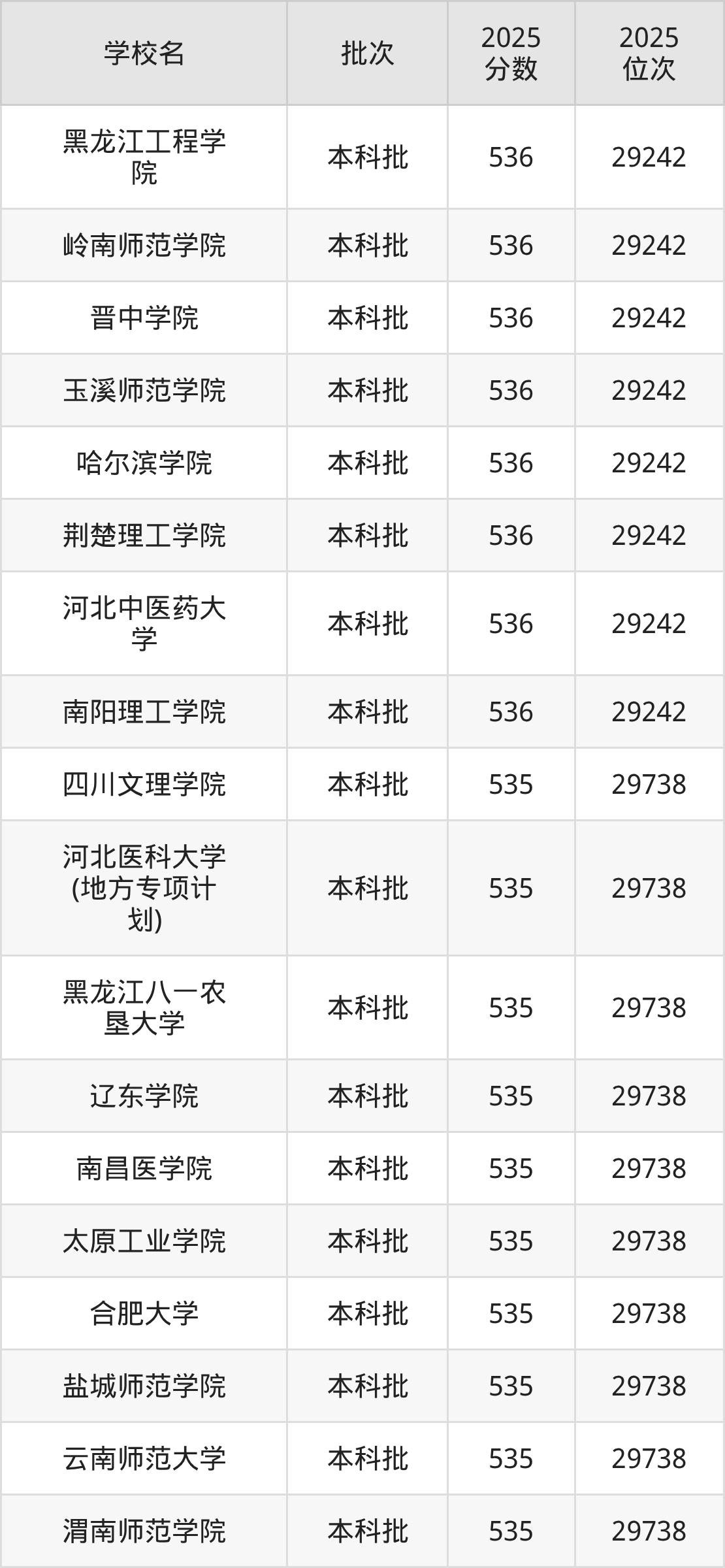 2025年河北高考历史类535分(29243名~29738名)能上的大学有辽东学院、太原工业学院、盐城师范学院、云南师范大学等。