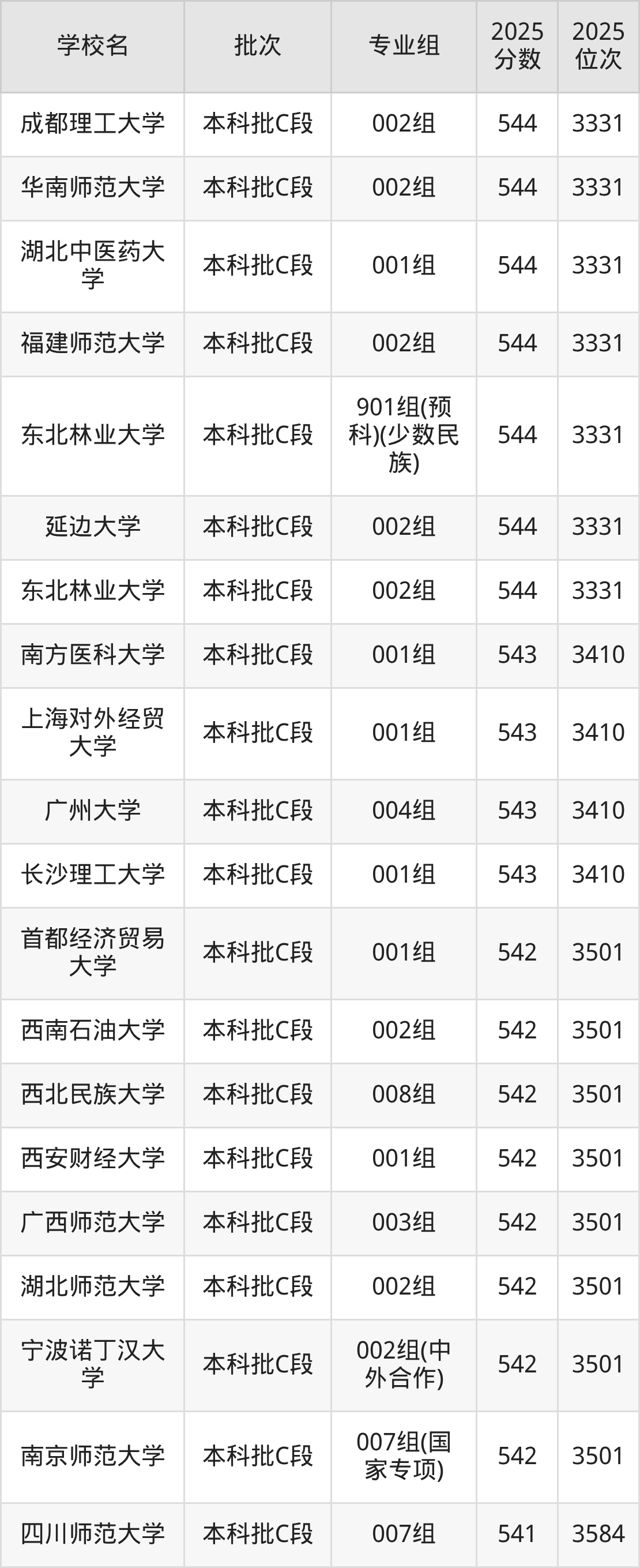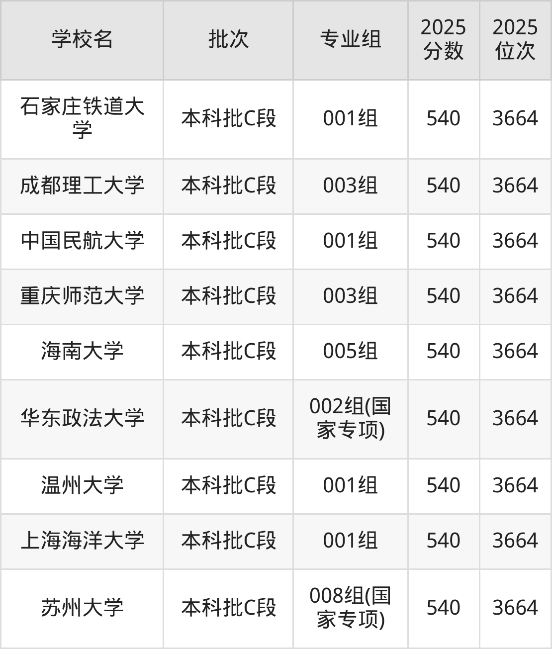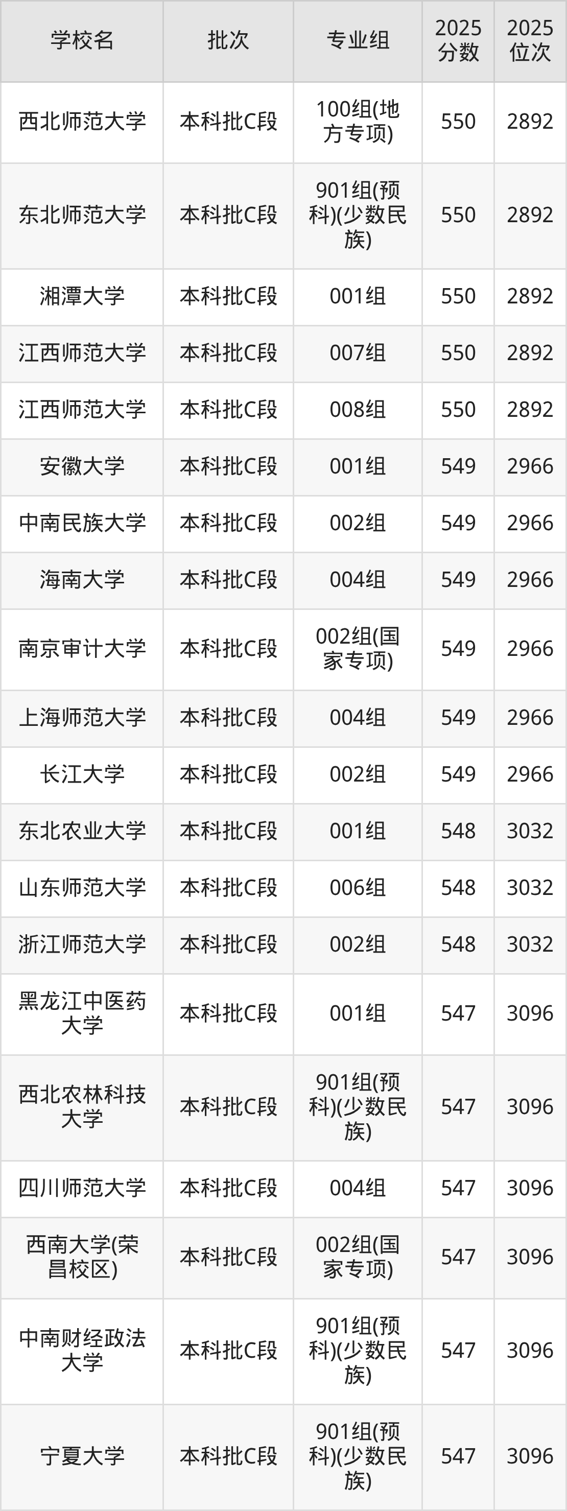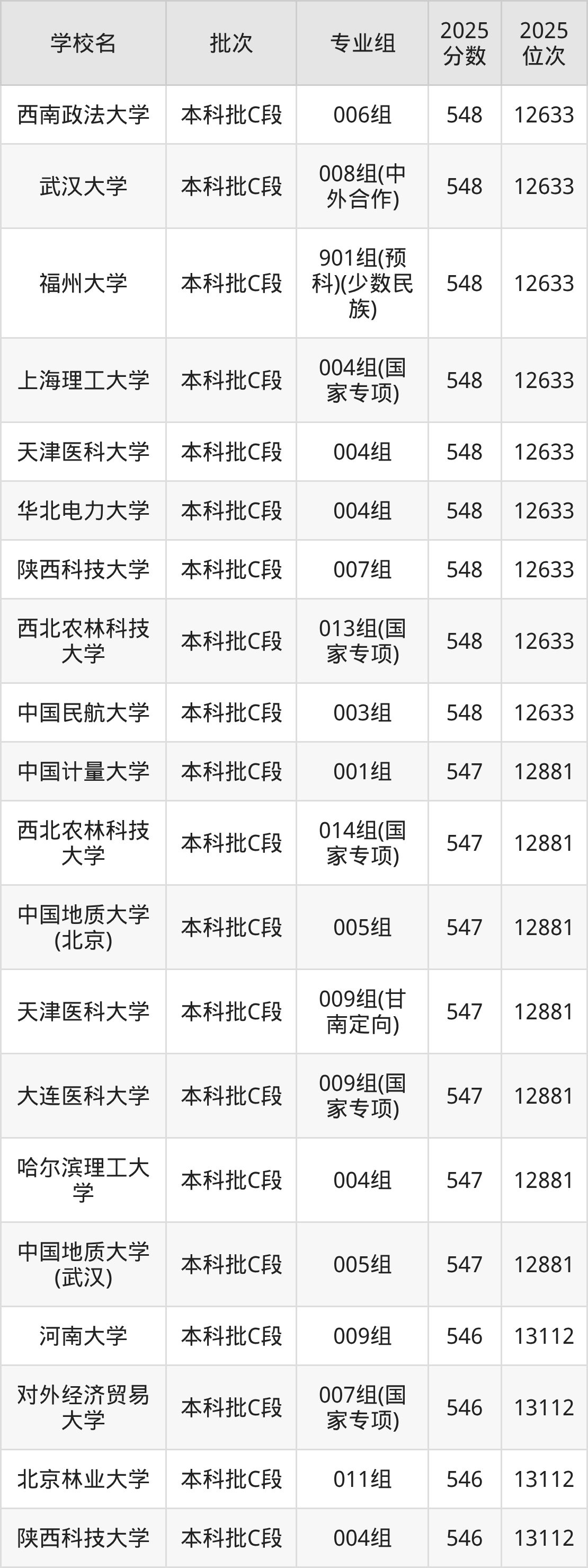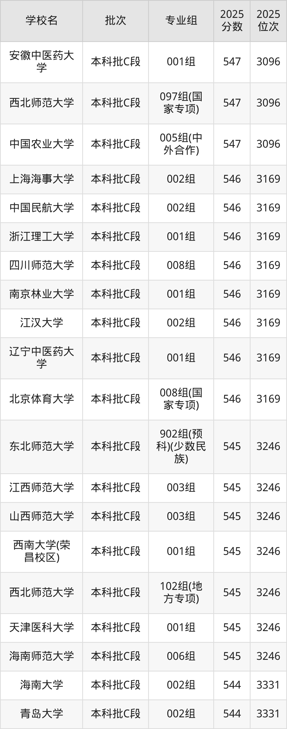 2025年甘肃高考历史类545分(3170名~3246名)能上的大学有天津医科大学001组、山西师范大学003组、东北师范大学902组(预科)(少数民族)、江西师范大学003组等。