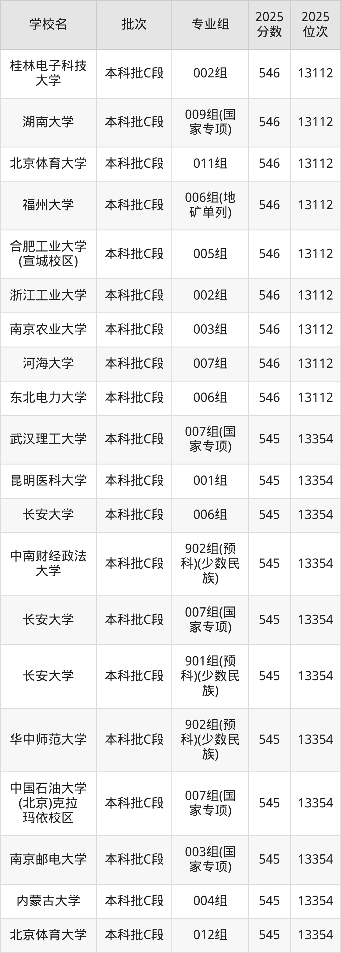 2025年甘肃高考物理类545分(13113名~13354名)能上的大学有北京体育大学012组、内蒙古大学004组、南京邮电大学003组(国家专项)、武汉理工大学007组(国家专项)等。