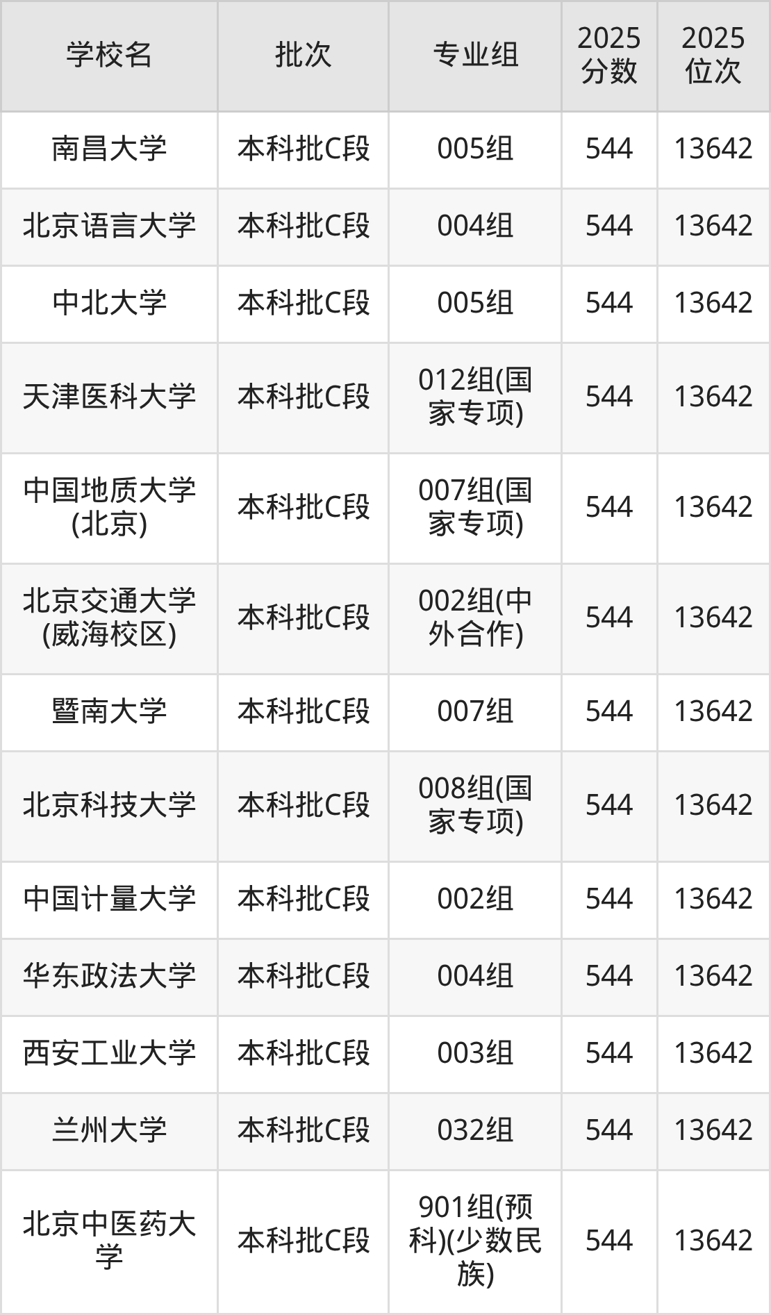 另外录取位次低于该区间(较稳妥)的有北京中医药大学901组(预科)(少数民族)(13642名)、南昌大学005组(13642名)等;录取位次高于该区间(可冲)的有北京林业大学011组(13112名)、对外经济贸易大学007组(国家专项)(13112名)等。