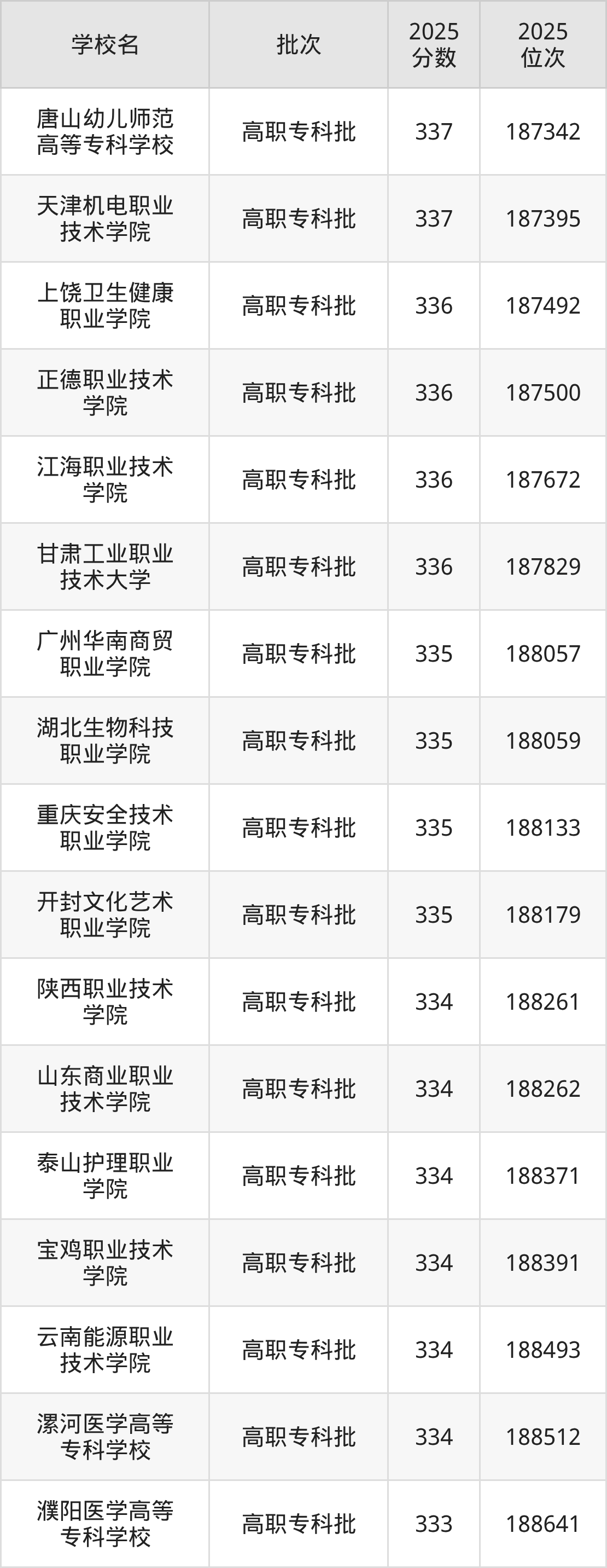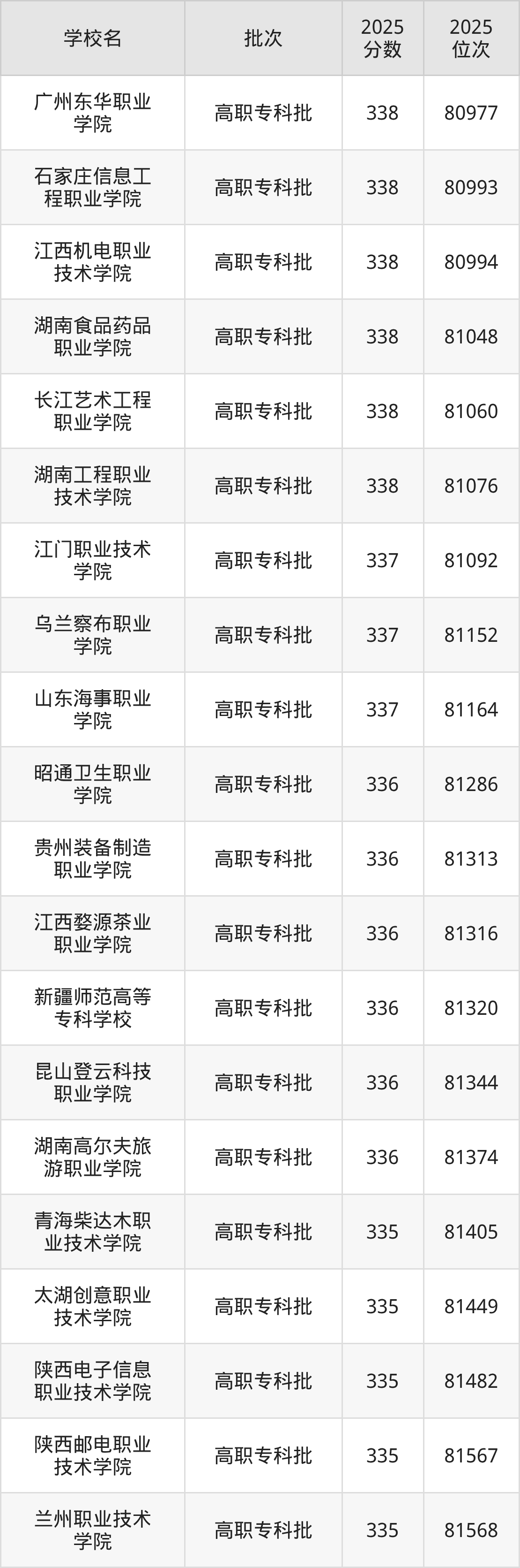 2025年贵州高考物理类335分(187839名~188204名)能上的大学有湖北生物科技职业学院、广州华南商贸职业学院、重庆安全技术职业学院、开封文化艺术职业学院。