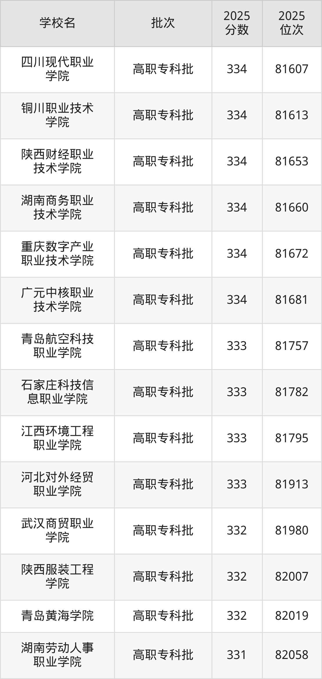 2025年贵州高考历史类335分(81395名~81568名)能上的大学有陕西电子信息职业技术学院、青海柴达木职业技术学院、太湖创意职业技术学院、陕西邮电职业技术学院等。