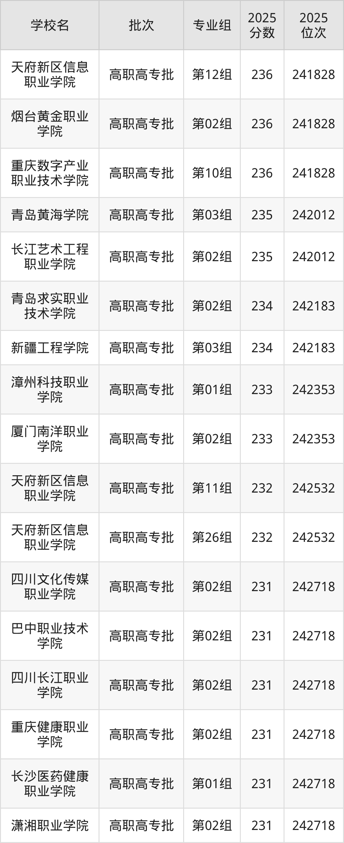 另外录取位次低于该区间(较稳妥)的有天府新区信息职业学院第11组(242532名)、天府新区信息职业学院第26组(242532名)等;录取位次高于该区间(可冲)的有青岛求实职业技术学院第02组(242183名)、新疆工程学院第03组(242183名)等。