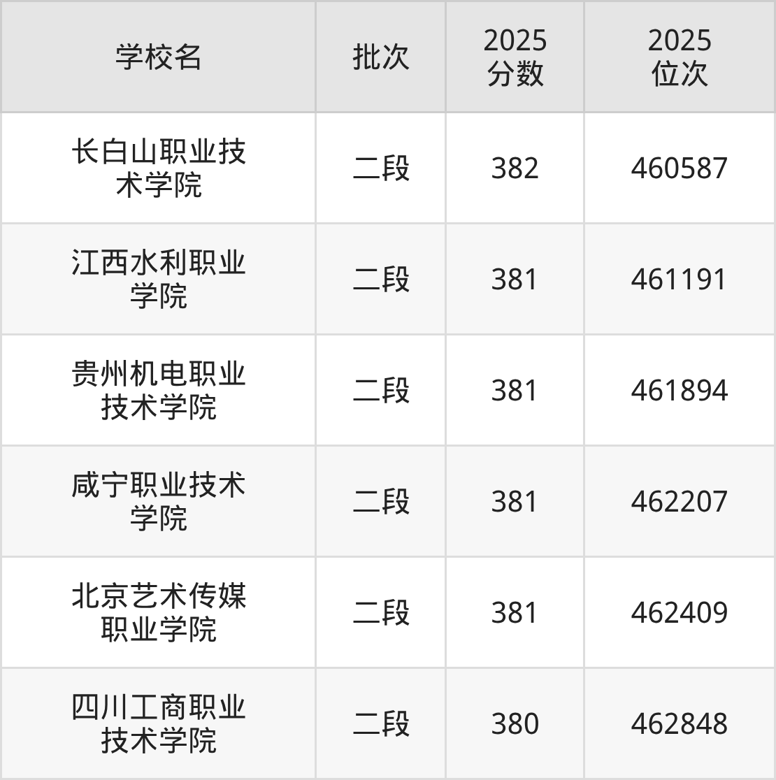 2025年山东高考381分(460852名~462841名)能上的大学有咸宁职业技术学院、北京艺术传媒职业学院、江西水利职业学院、贵州机电职业技术学院。