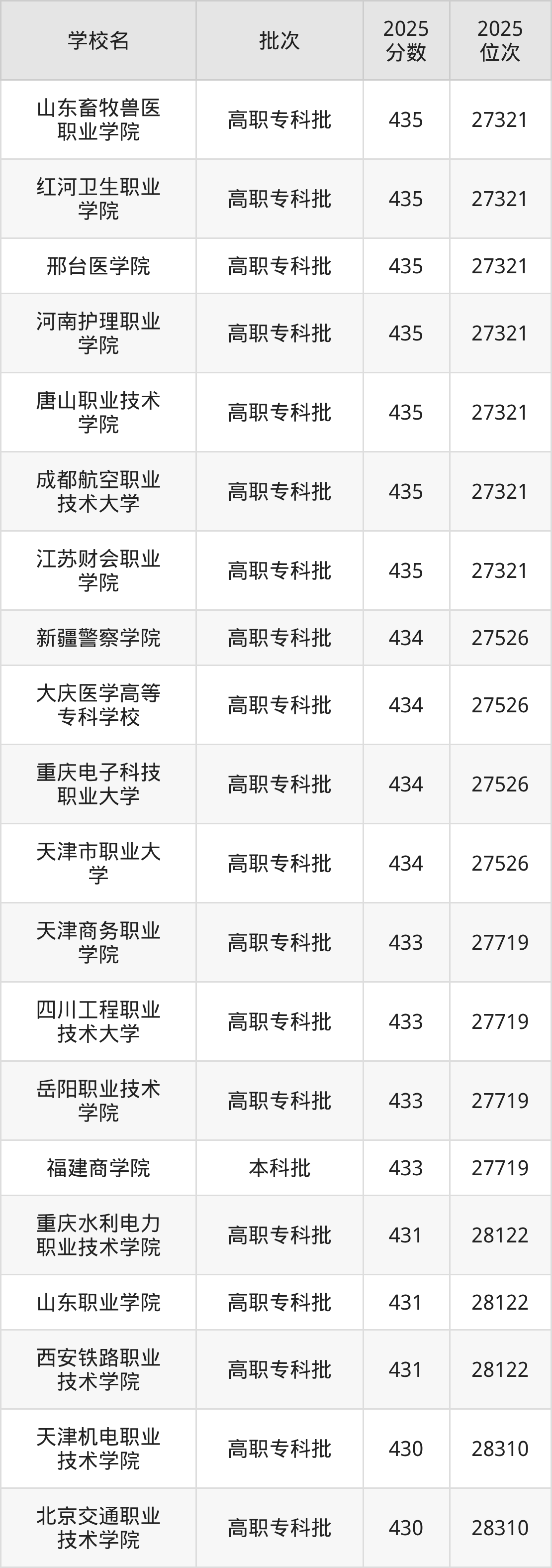 2025年辽宁高考历史类432分(27720名~27921名)录取位次低于该区间(较稳妥)的有西安铁路职业技术学院(28122名)、山东职业学院(28122名)等;录取位次高于该区间(可冲)的有岳阳职业技术学院(27719名)、福建商学院(27719名)等。
