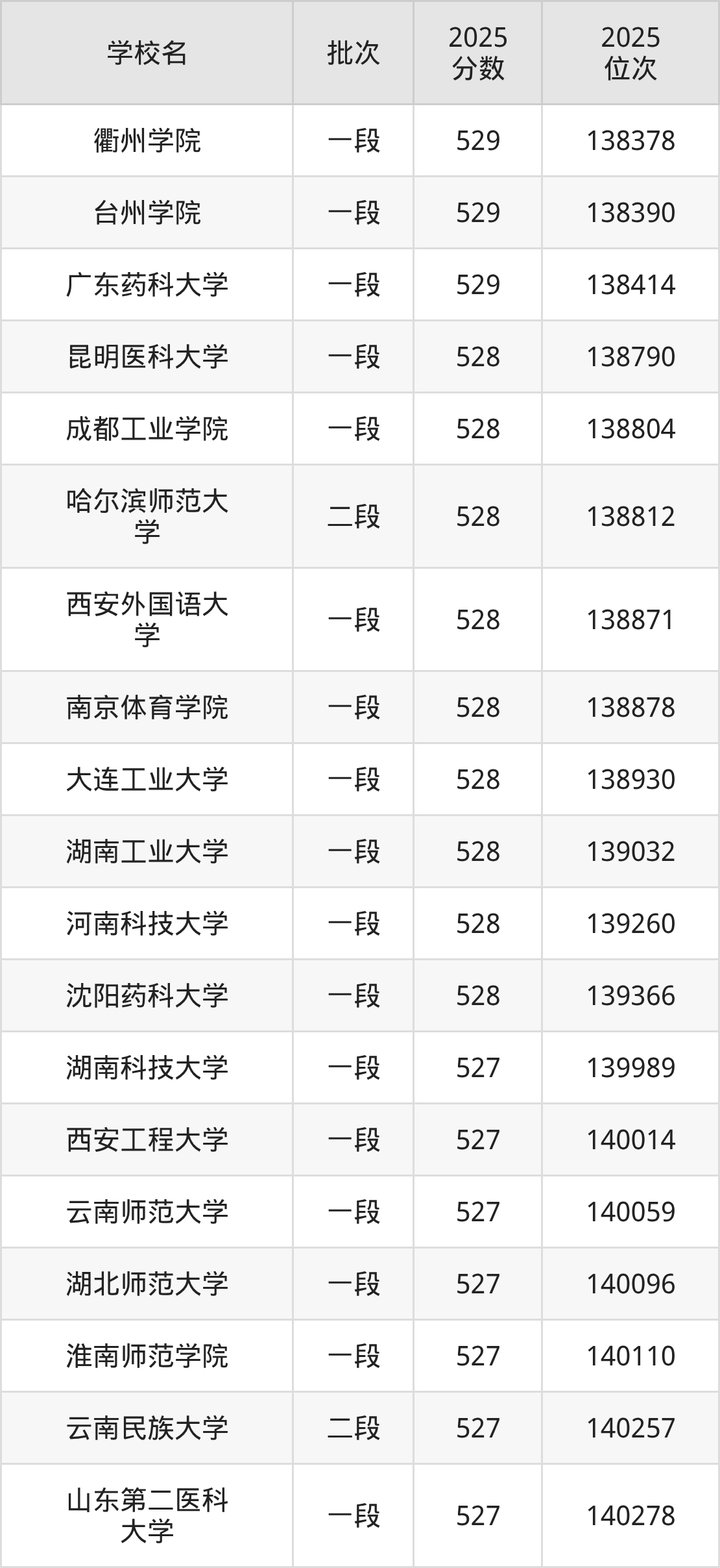这些都是2026年高考138776名~139942名考生可以报考的大学,更多学校名单如下表所示: