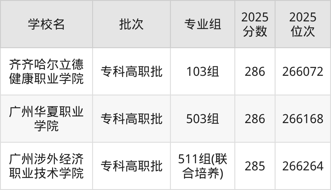 2025年广东高考历史类286分(265643名~266167名)能上的大学有广州华夏职业学院503组、齐齐哈尔立德健康职业学院103组。