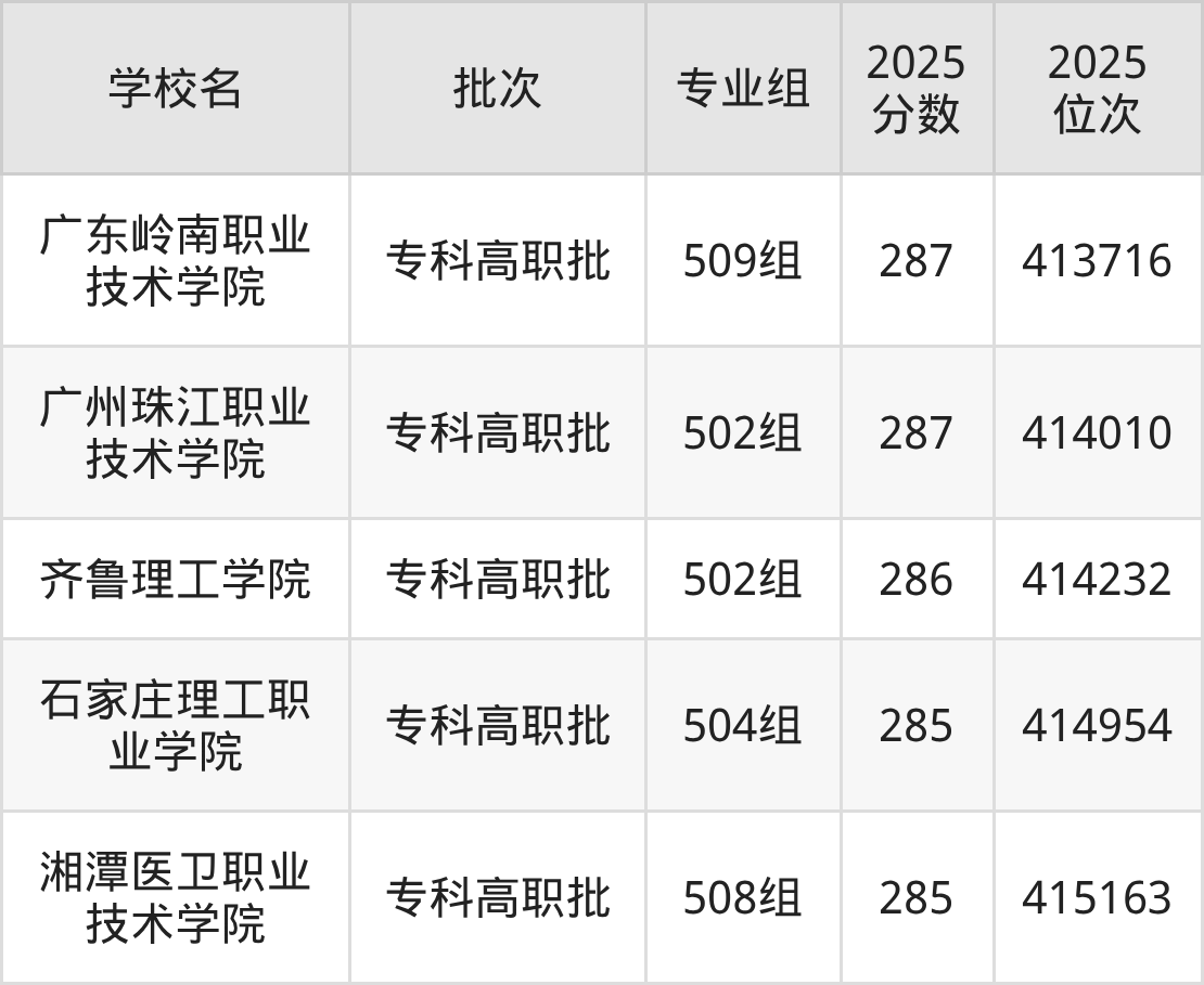 另外录取位次低于该区间(较稳妥)的有石家庄理工职业学院504组(414954名)、湘潭医卫职业技术学院508组(415163名)等;录取位次高于该区间(可冲)的有广州珠江职业技术学院502组(414010名)、广东岭南职业技术学院509组(413716名)等。
