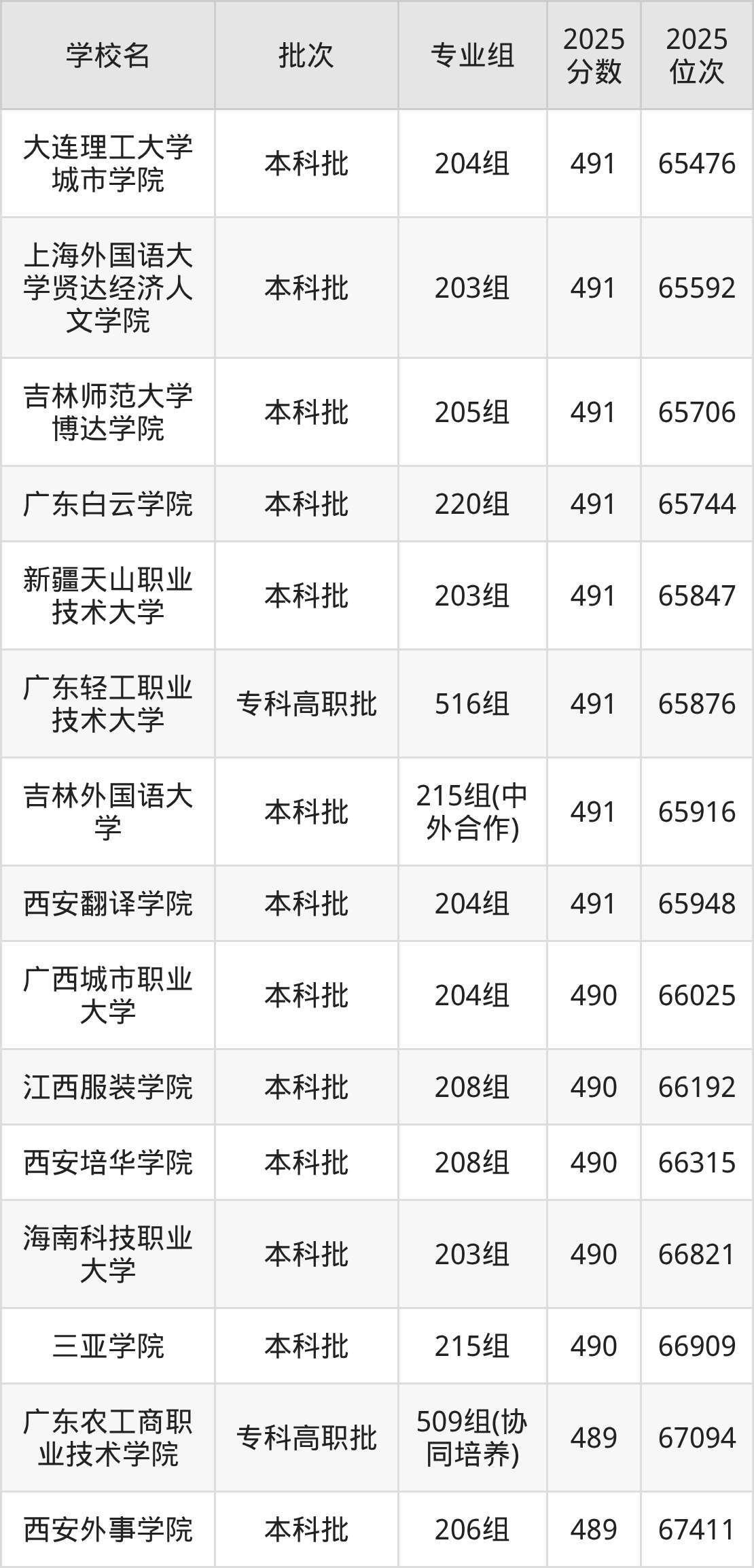 2025年广东高考历史类490分(65975名~66918名)能上的大学有西安培华学院208组、江西服装学院208组、三亚学院215组、广西城市职业大学204组等。