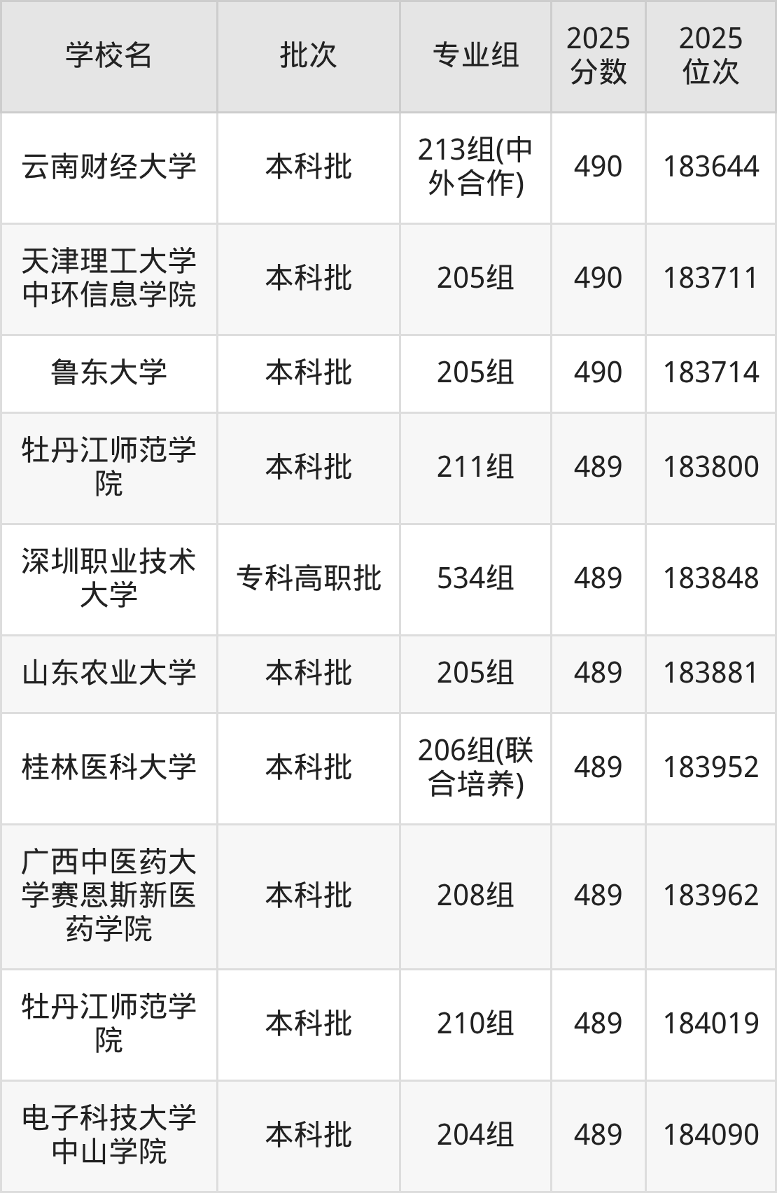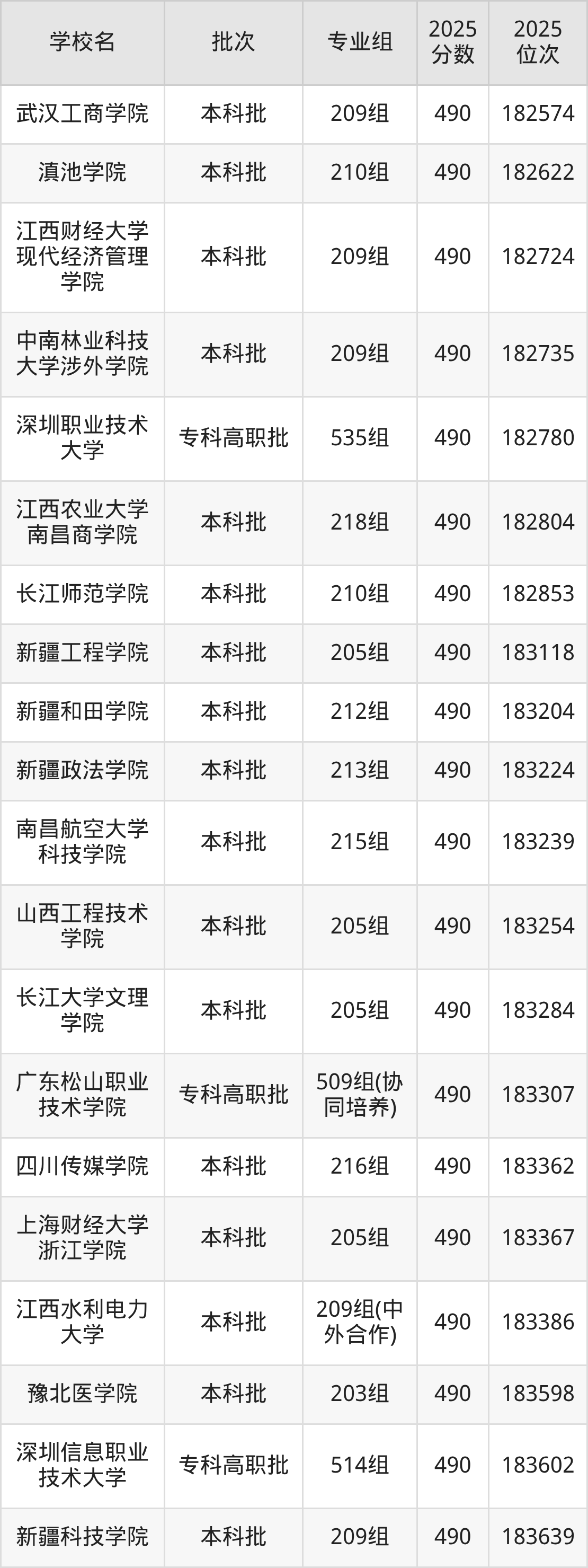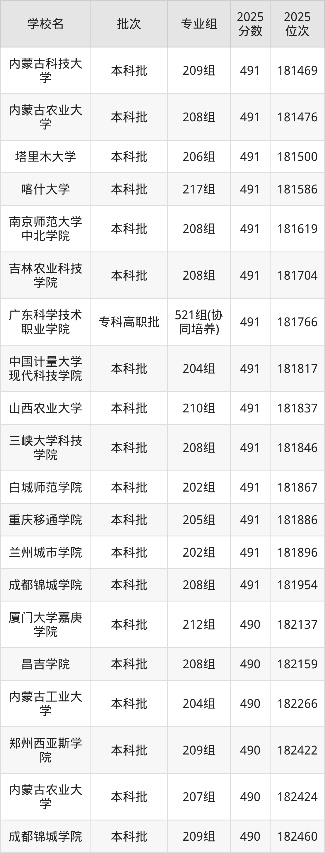 2025年广东高考物理类490分(181964名~183772名)能上的大学有内蒙古工业大学204组、内蒙古农业大学207组、鲁东大学205组、长江师范学院210组等。