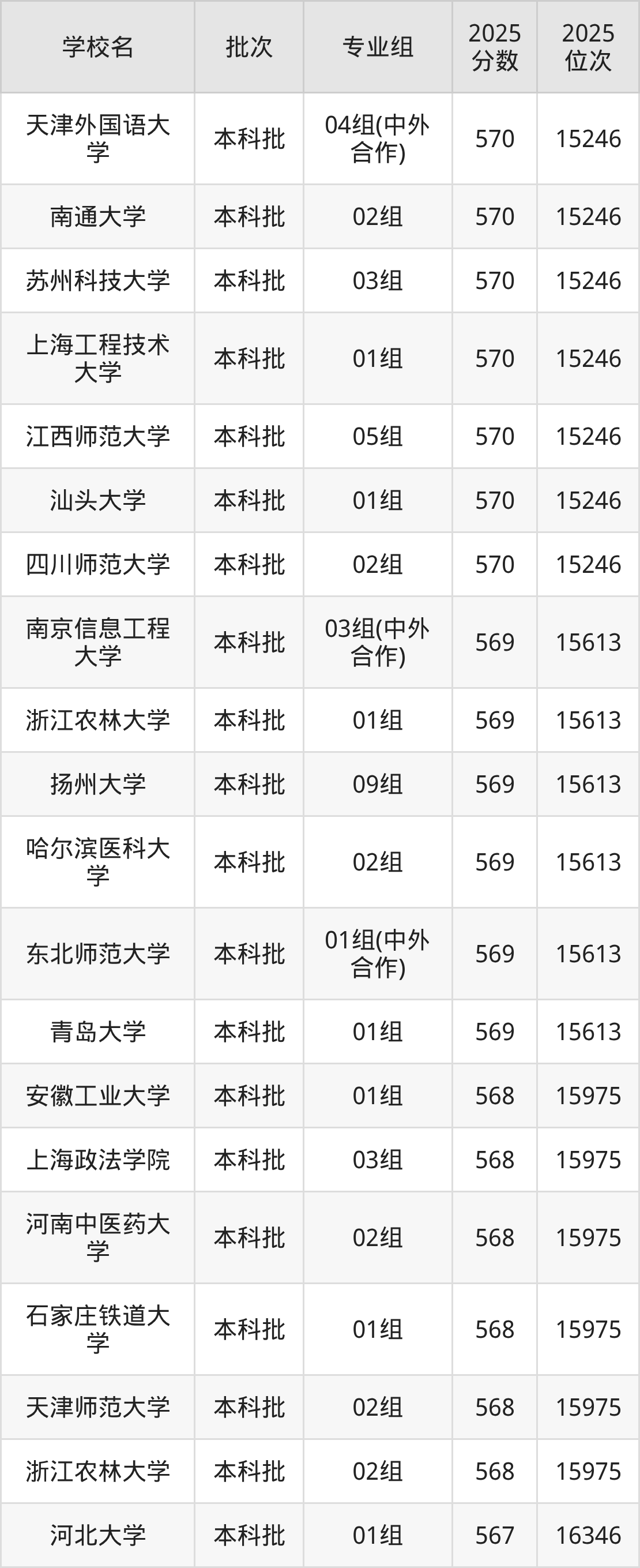 2025年江苏高考历史类568分(15614名~15975名)能上的大学有上海政法学院03组、浙江农林大学02组、安徽工业大学01组、天津师范大学02组等。