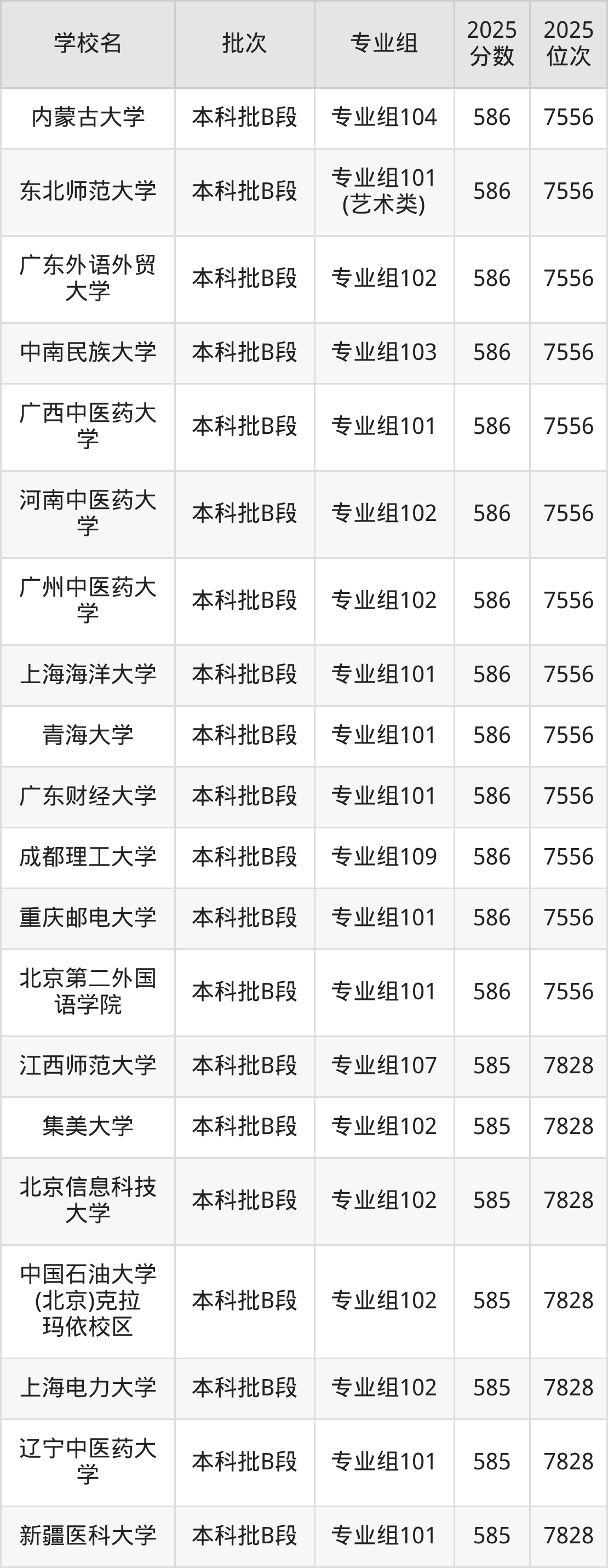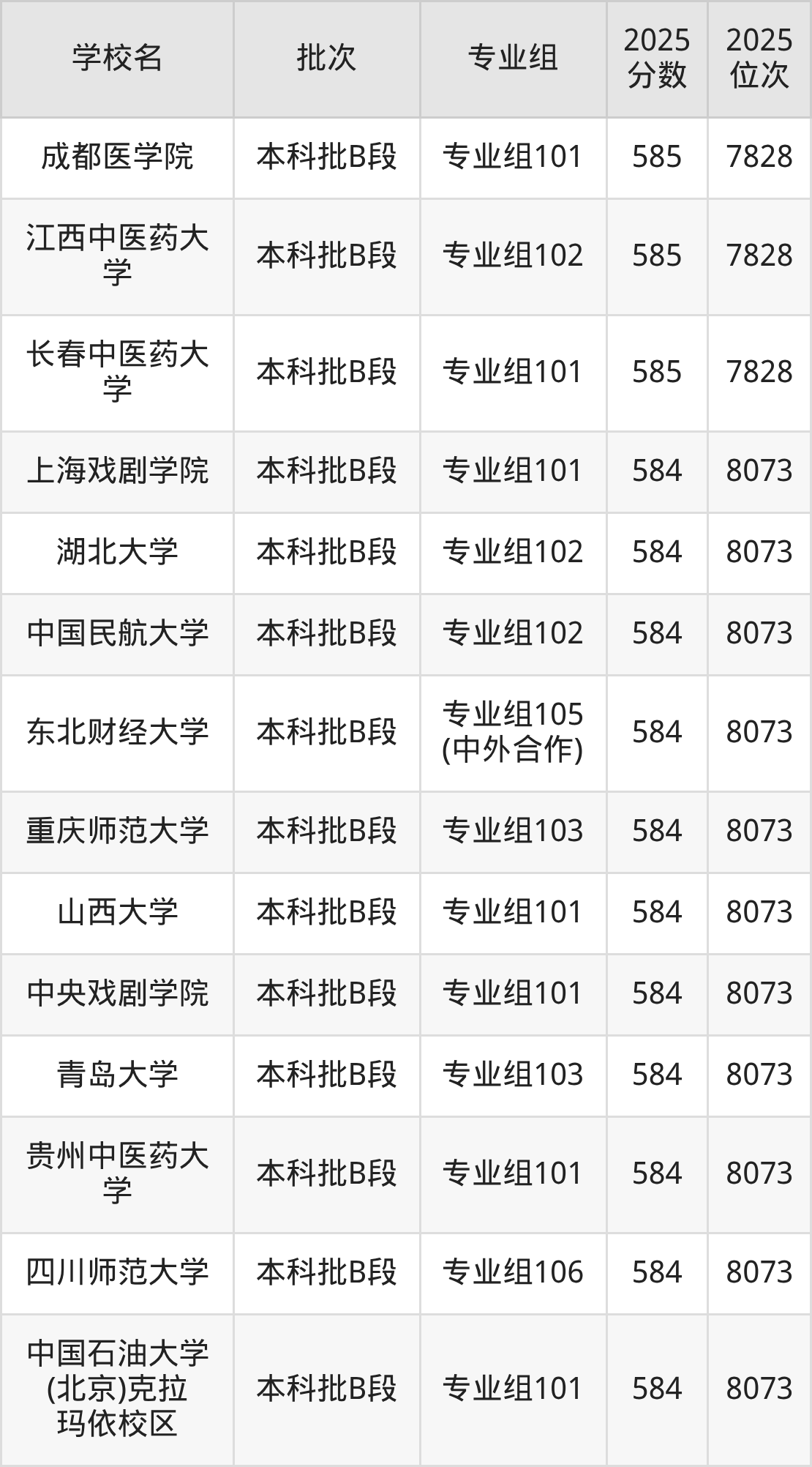 2025年四川高考历史类585分(7557名~7828名)能上的大学有长春中医药大学专业组101、江西中医药大学专业组102、成都医学院专业组101、中国石油大学(北京)克拉玛依校区专业组102等。