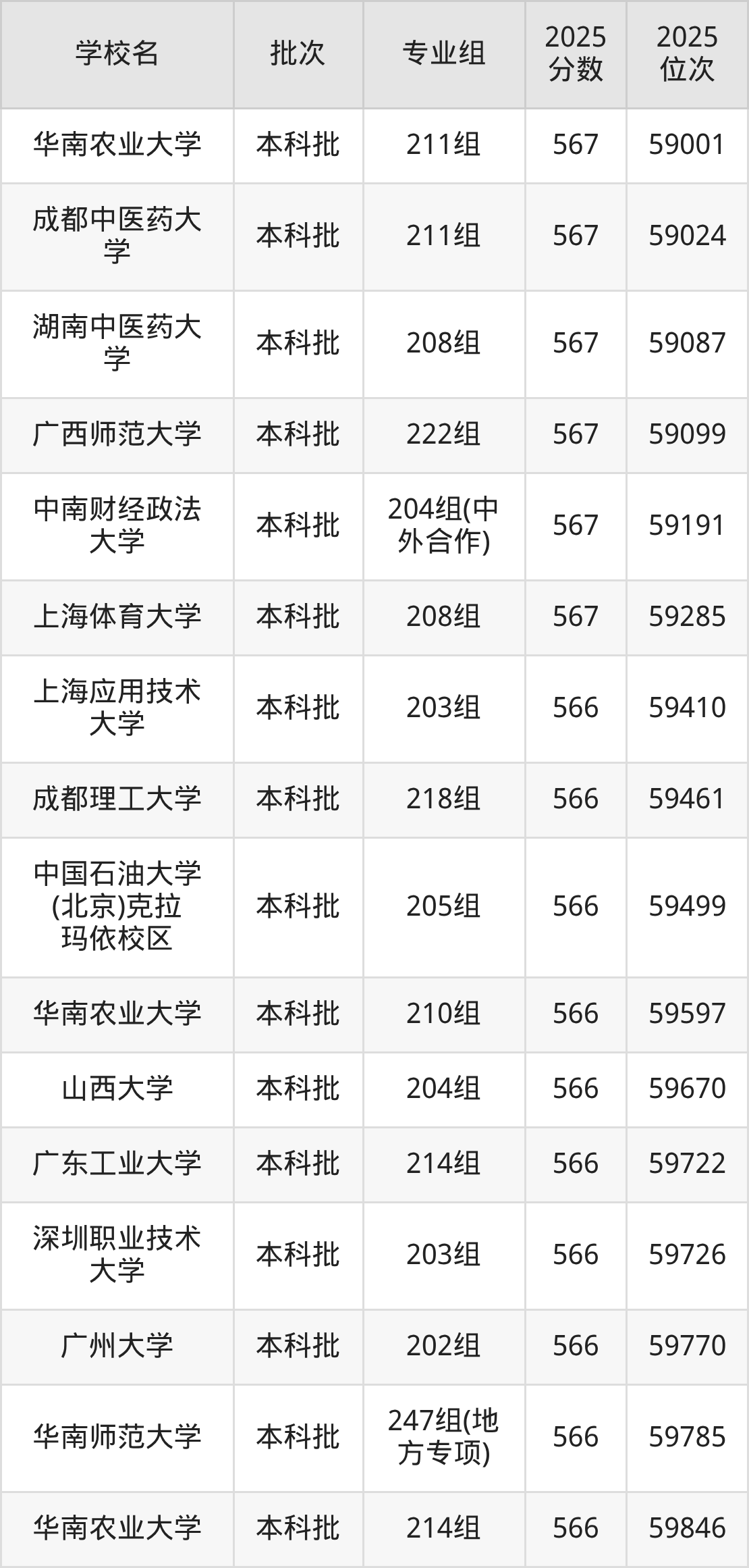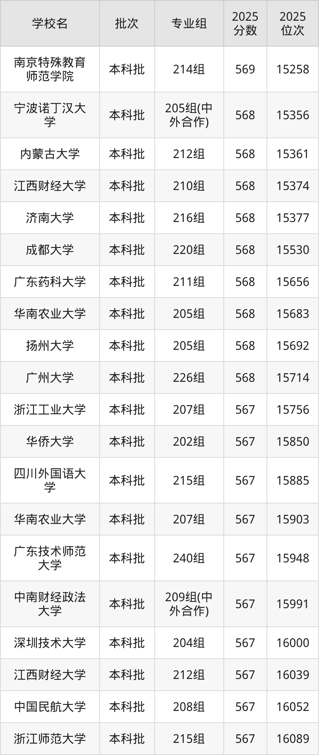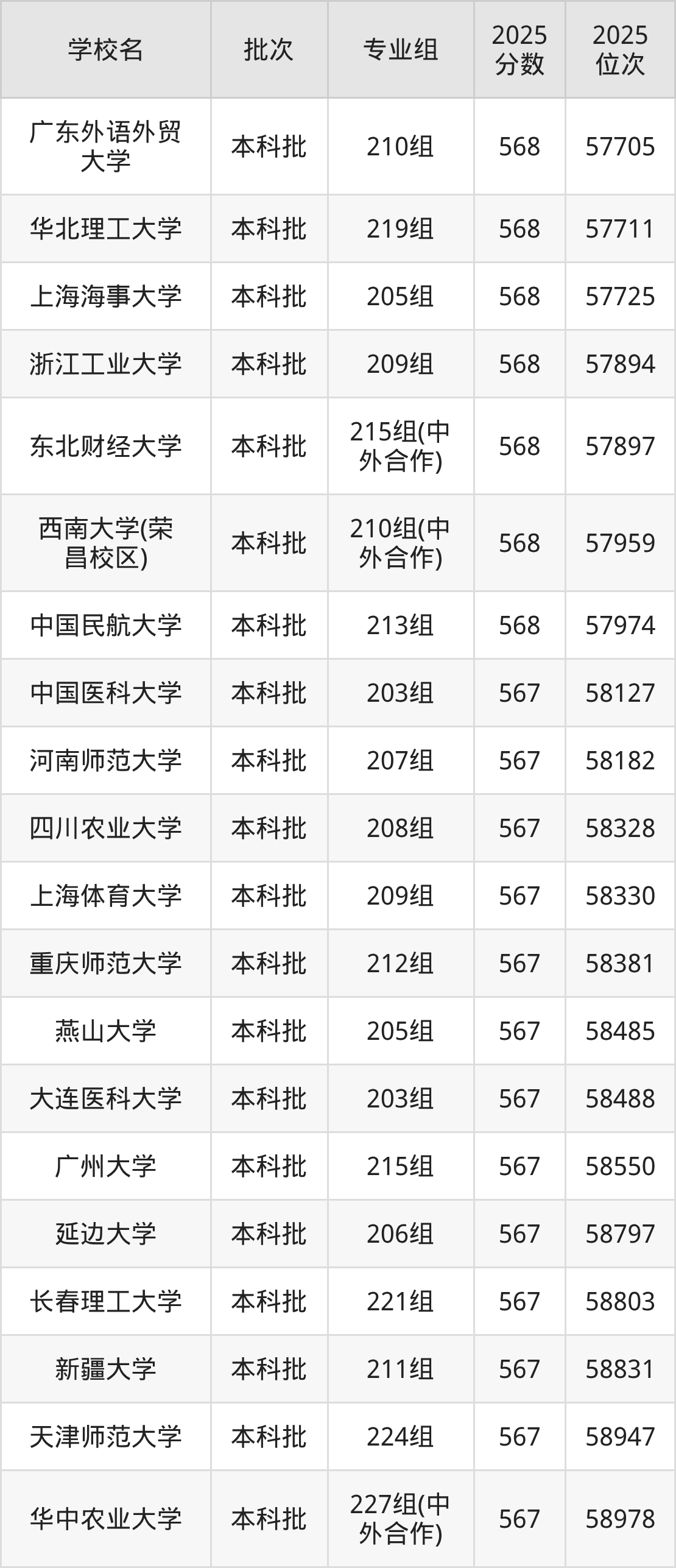 2025年广东高考物理类567分(58085名~59354名)能上的大学有天津师范大学224组、中国医科大学203组、大连医科大学203组、延边大学206组等。