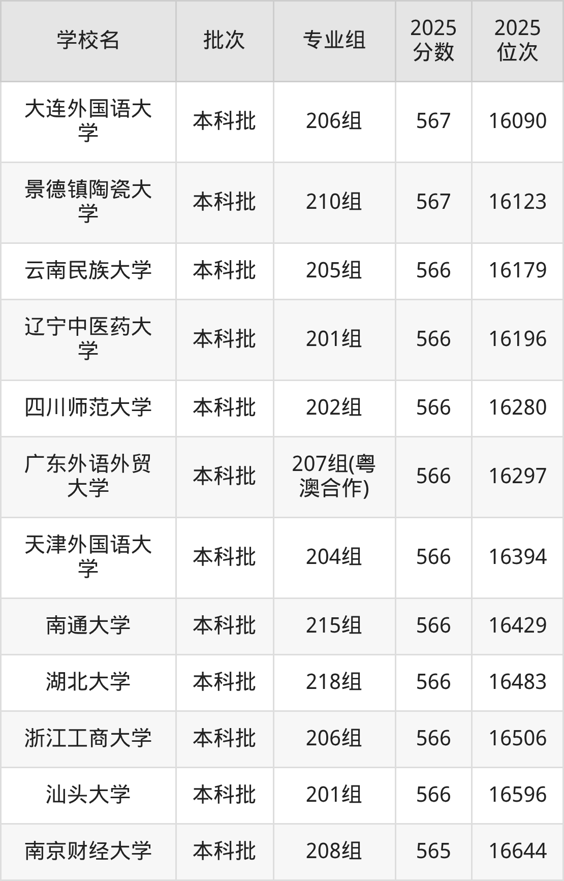 这些都是2026年高考历史类15729名~16169名考生可以报考的大学,更多学校名单如下表所示: