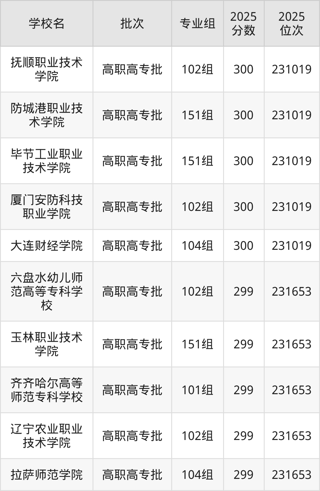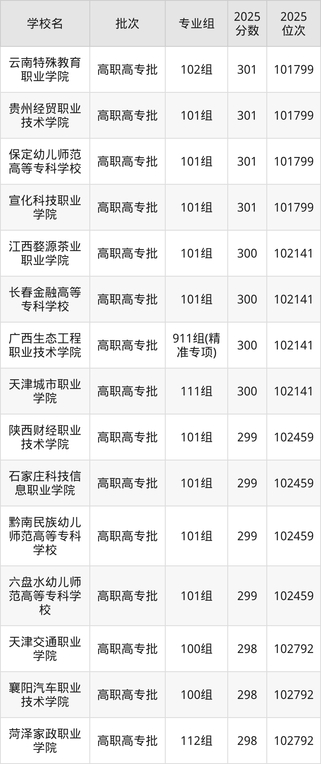 2025年广西高考历史类299分(102142名~102459名)能上的大学有陕西财经职业技术学院101组、石家庄科技信息职业学院101组、黔南民族幼儿师范高等专科学校101组、六盘水幼儿师范高等专科学校101组。