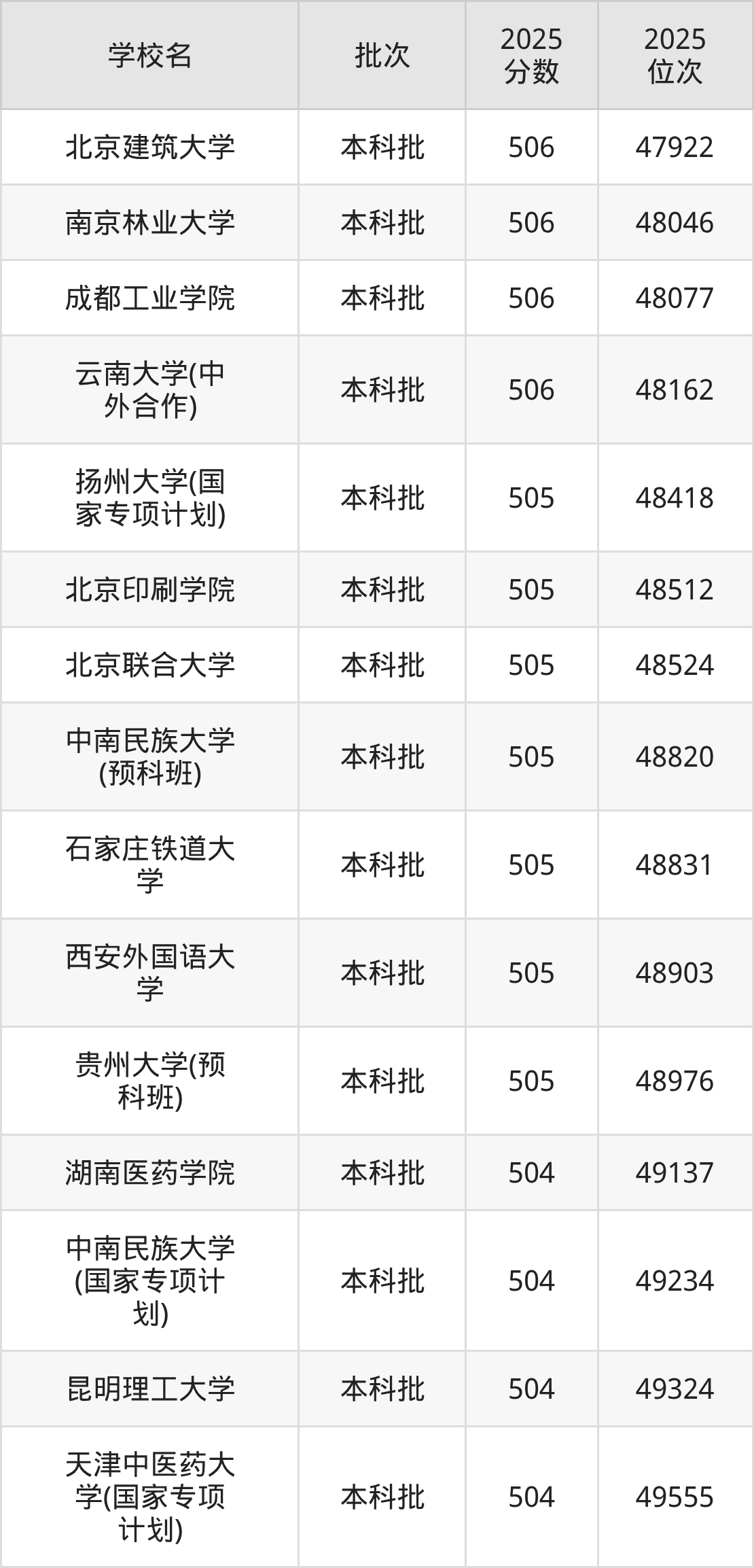 2025年贵州高考物理类505分(48360名~49105名)能上的大学有北京联合大学、北京印刷学院、中南民族大学(预科班)、贵州大学(预科班)等。