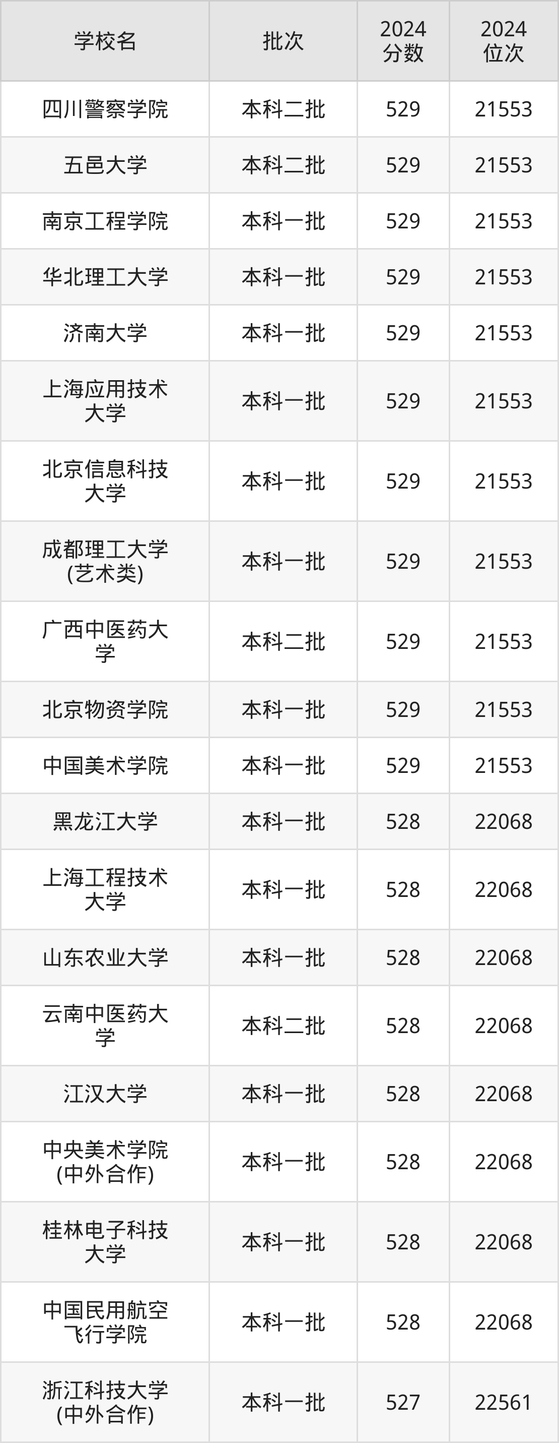 2024年河南高考文科528分(21554名~22068名)能上的大学有黑龙江大学、上海工程技术大学、中国民用航空飞行学院、桂林电子科技大学等。