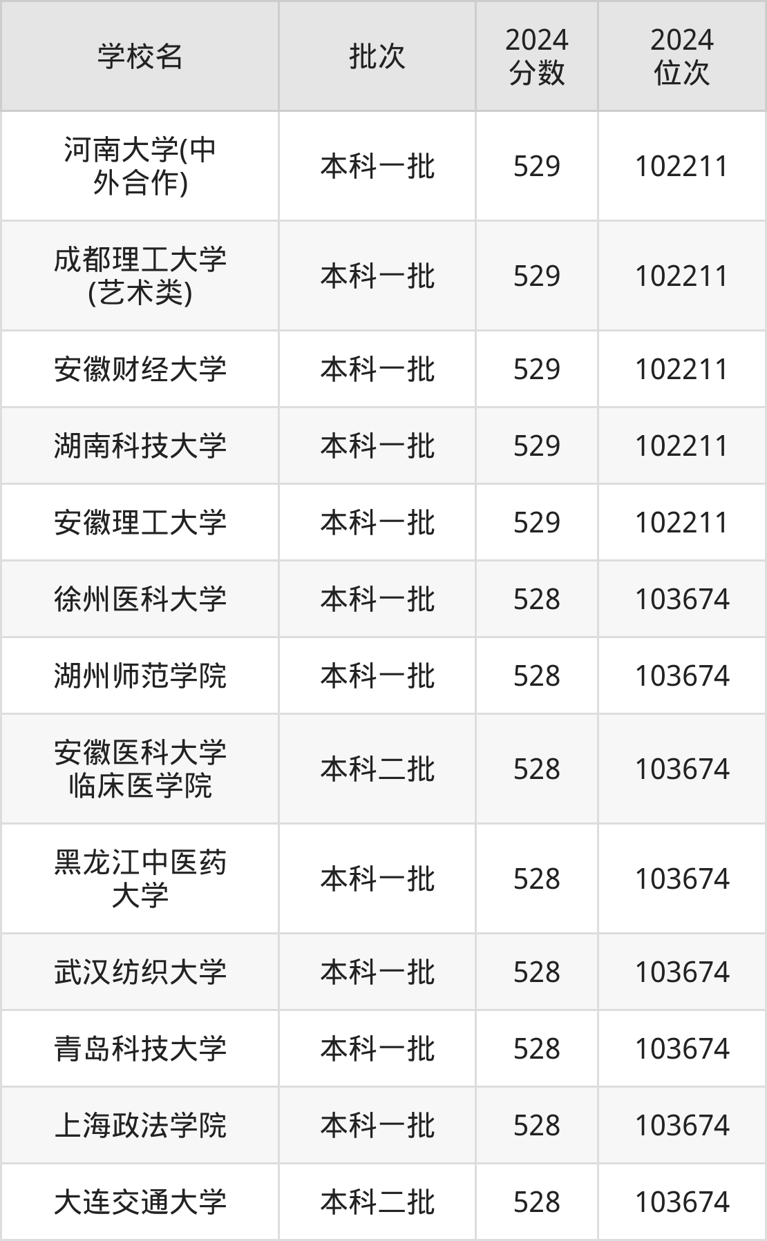 2024年河南高考理科528分(102212名~103674名)能上的大学有大连交通大学、上海政法学院、青岛科技大学、武汉纺织大学等。
