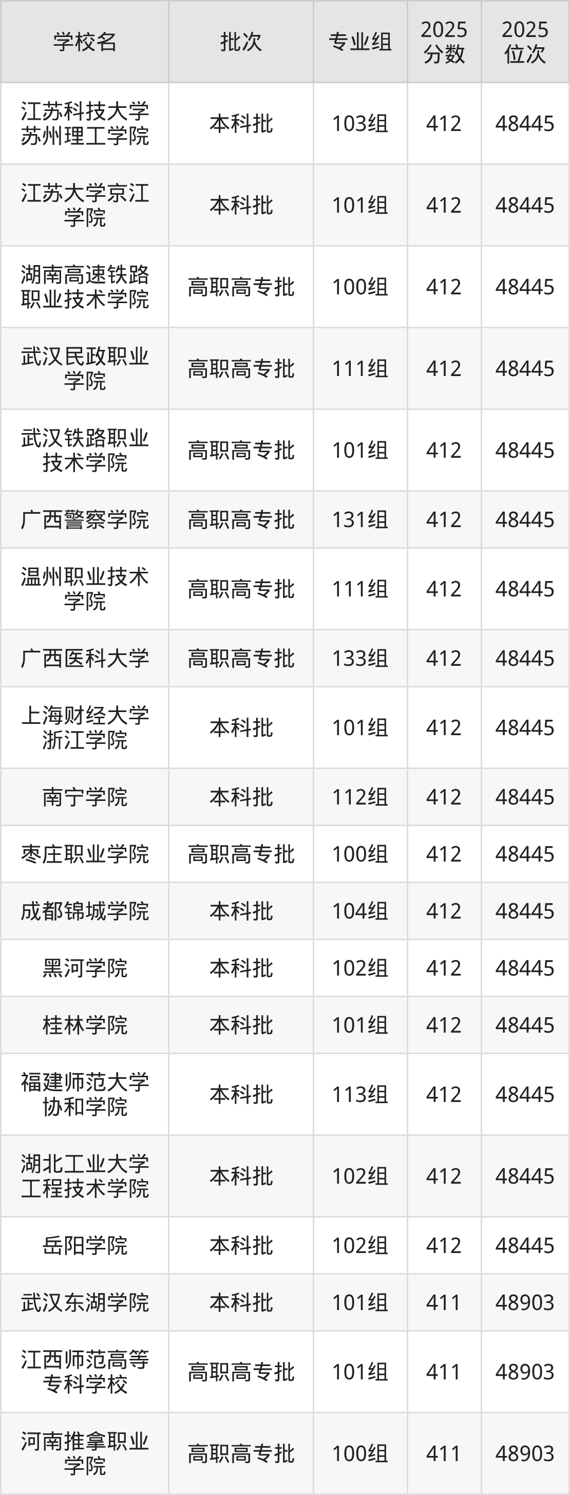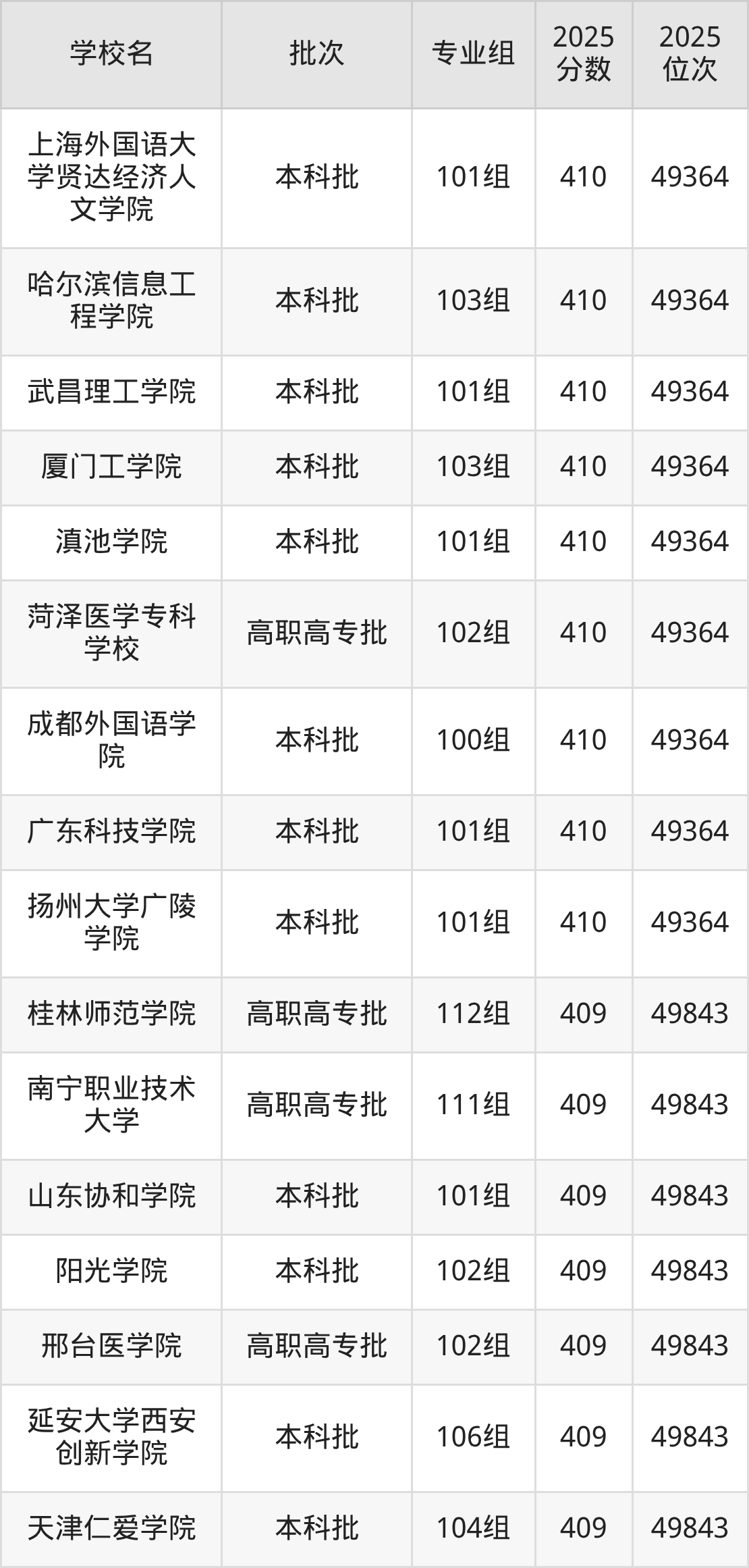 2025年广西高考历史类410分(48904名~49364名)能上的大学有哈尔滨信息工程学院103组、武昌理工学院101组、厦门工学院103组、滇池学院101组等。