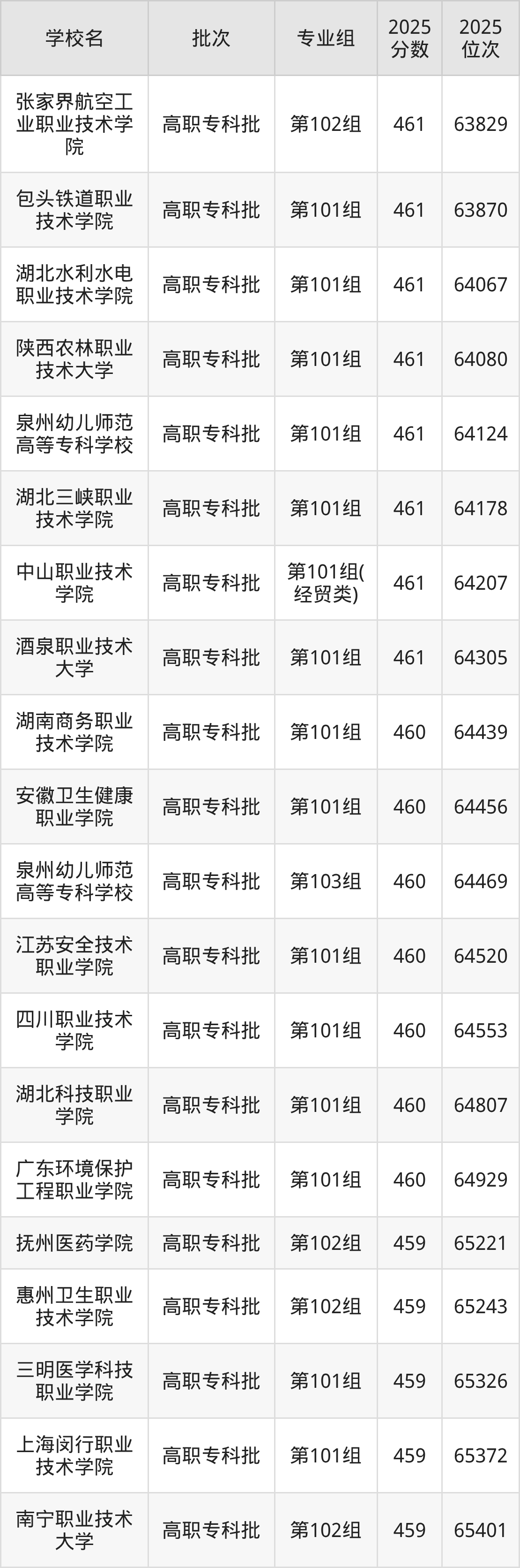 2025年江西高考历史类460分(64327名~64957名)能上的大学有江苏安全技术职业学院第101组、四川职业技术学院第101组、泉州幼儿师范高等专科学校第103组、安徽卫生健康职业学院第101组等。