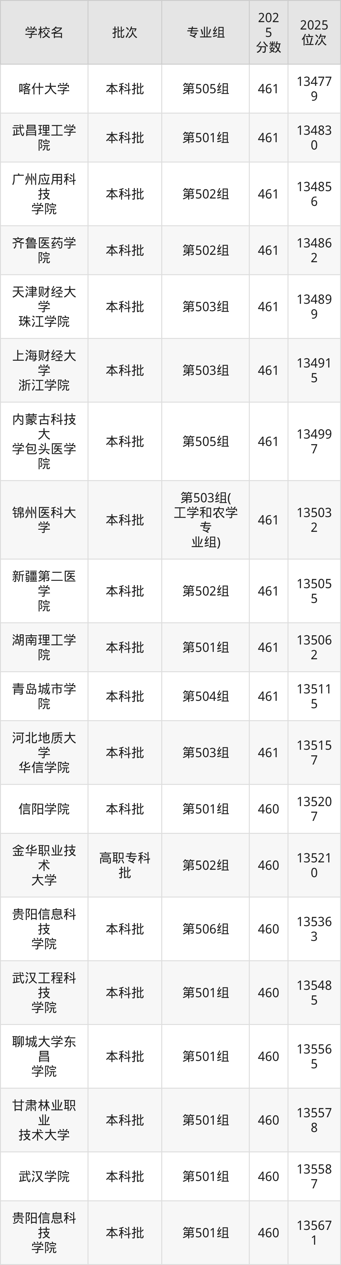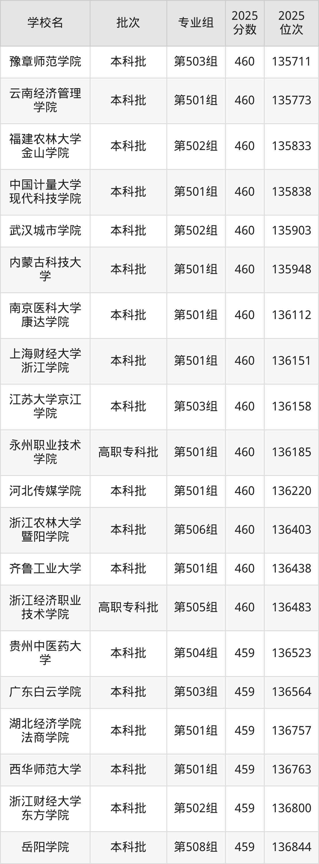 2025年江西高考物理类460分(135204名~136502名)能上的大学有河北传媒学院第501组、内蒙古科技大学第501组、齐鲁工业大学第501组、江苏大学京江学院第503组等。