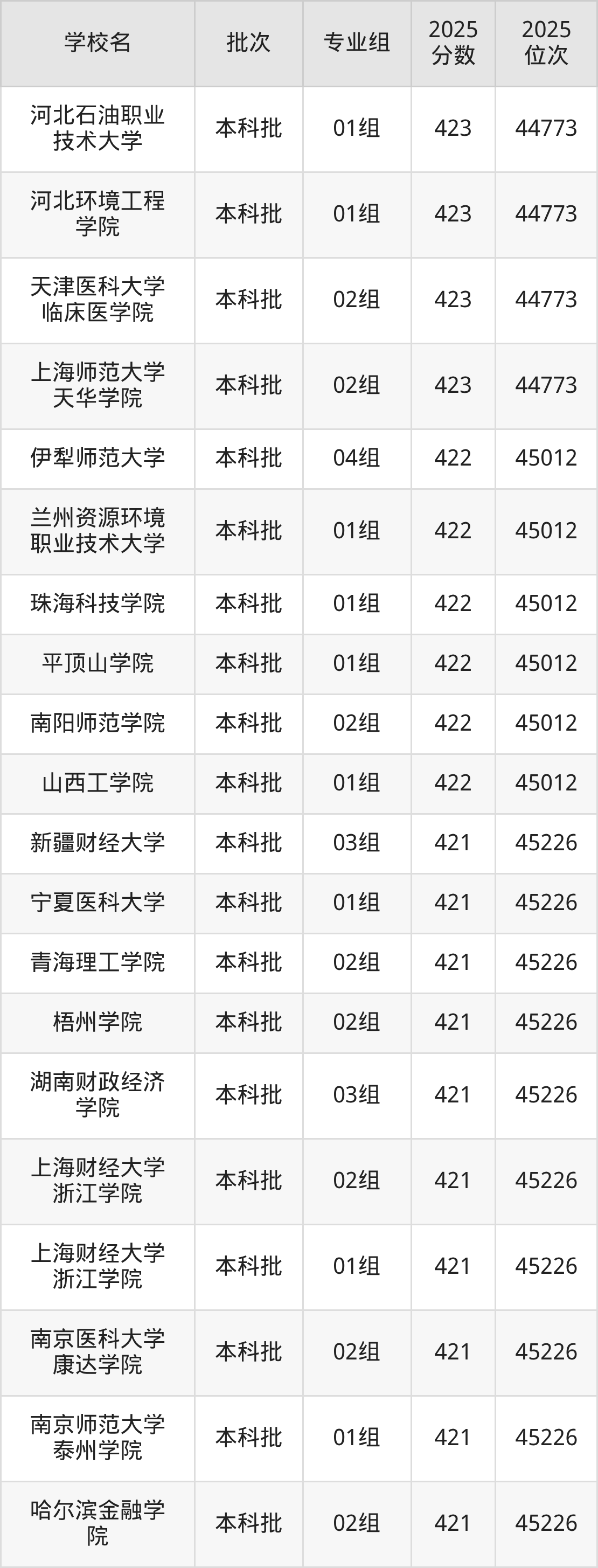 2025年上海高考421分(45013名~45226名)能上的大学有河北环境工程学院02组、吉林艺术学院01组、哈尔滨金融学院02组、南京师范大学泰州学院01组等。