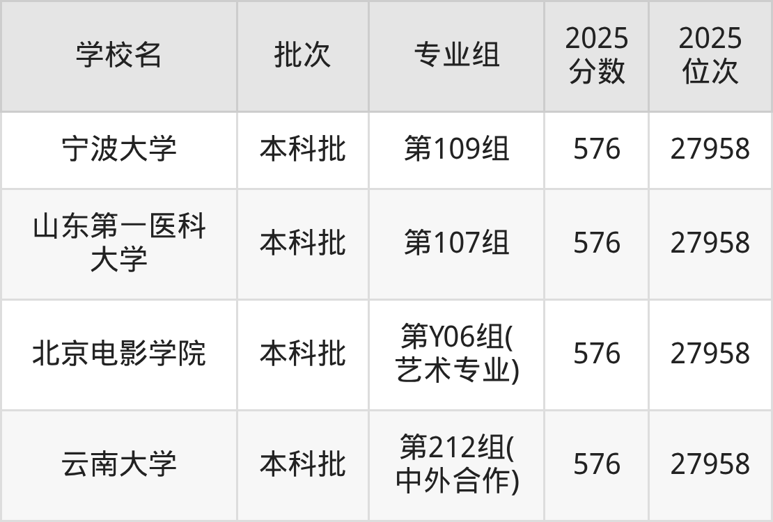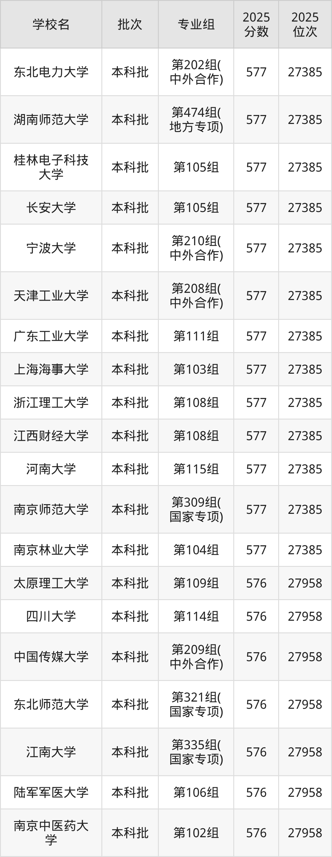 2025年湖南高考物理类576分(27386名~27958名)能上的大学有中国传媒大学第209组(中外合作)、太原理工大学第109组、东北师范大学第321组(国家专项)、江南大学第335组(国家专项)等。