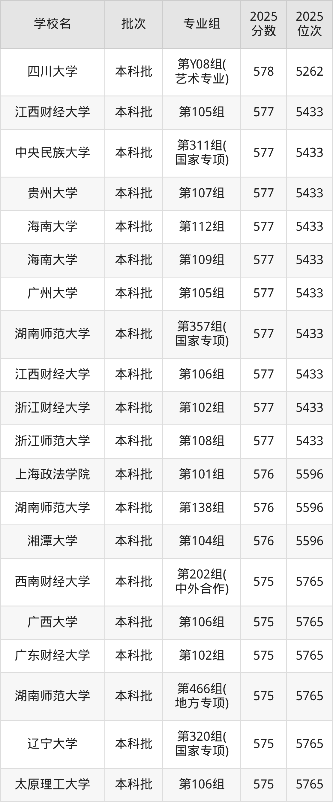 2025年湖南高考历史类576分(5434名~5596名)能上的大学有上海政法学院第101组、湖南师范大学第138组、湘潭大学第104组。