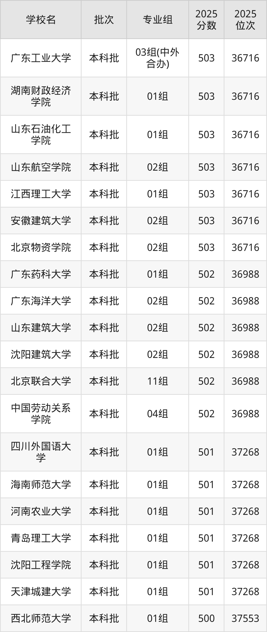 2025年北京高考501分(36989名~37268名)能上的大学有天津城建大学01组、沈阳工程学院01组、青岛理工大学01组、河南农业大学01组等。