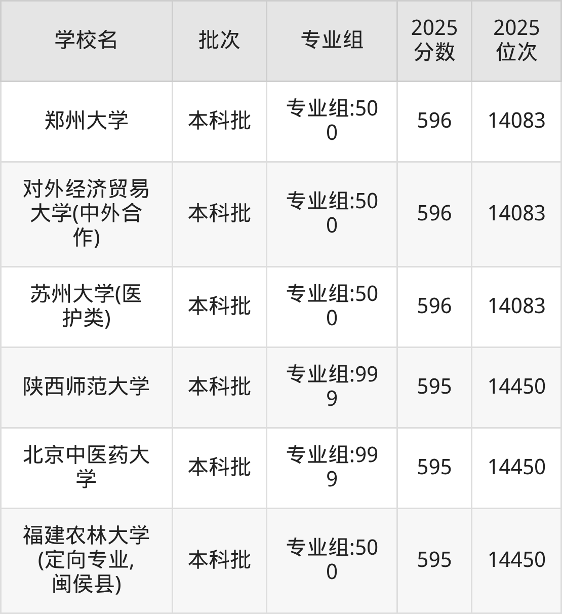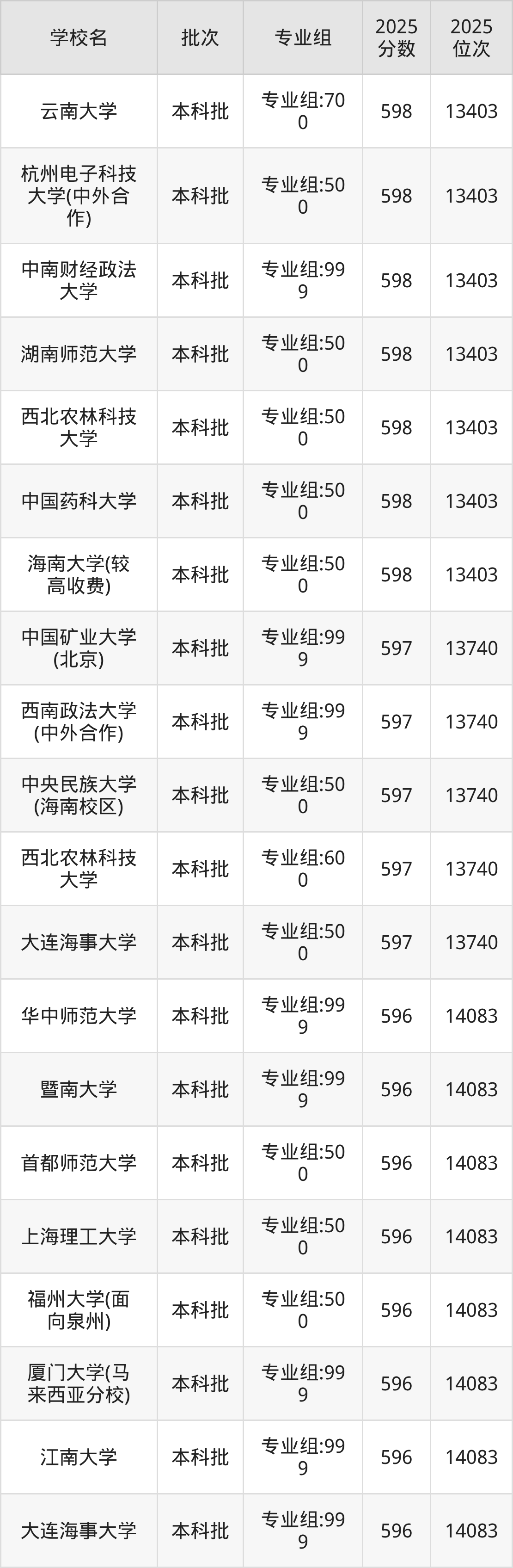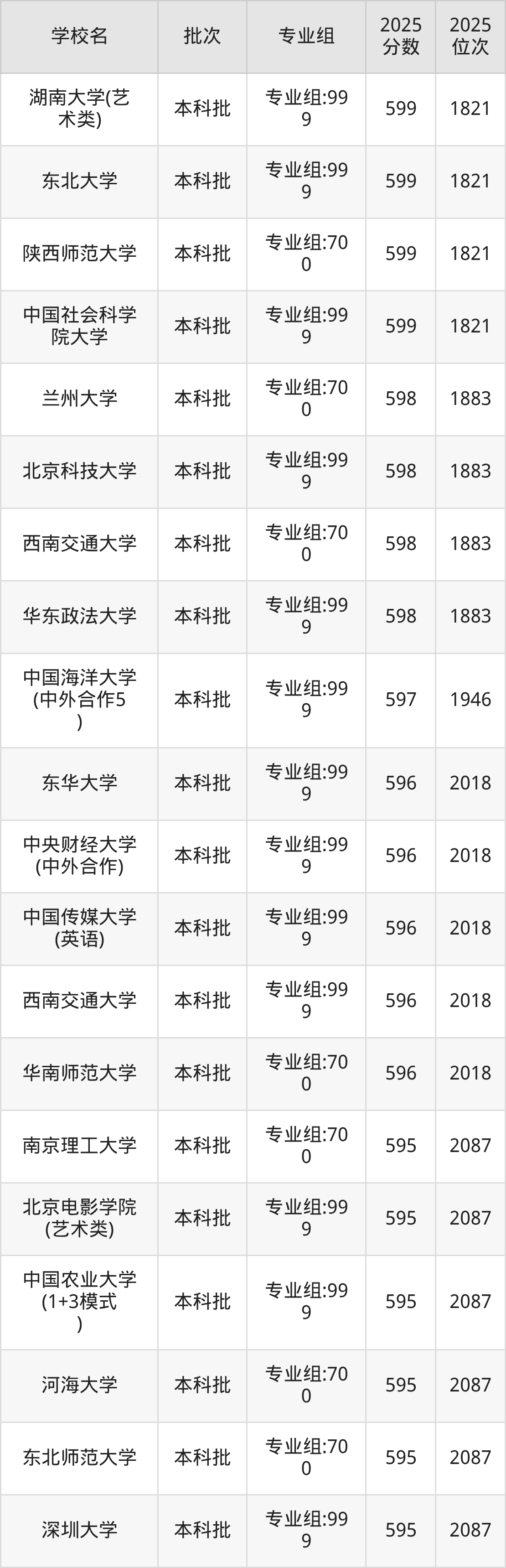 2025年福建高考历史类596分(1947名~2018名)能上的大学有东华大学专业组:999、华南师范大学专业组:700、西南交通大学专业组:999、中国传媒大学(英语)专业组:999等。