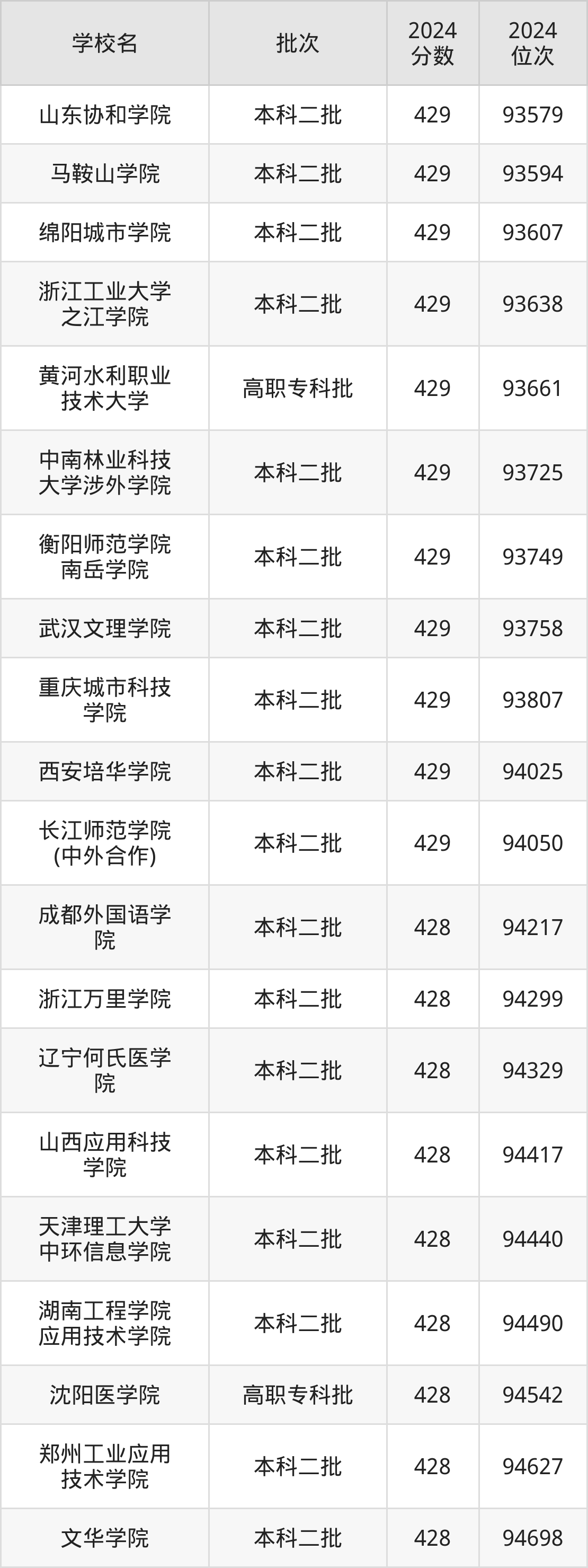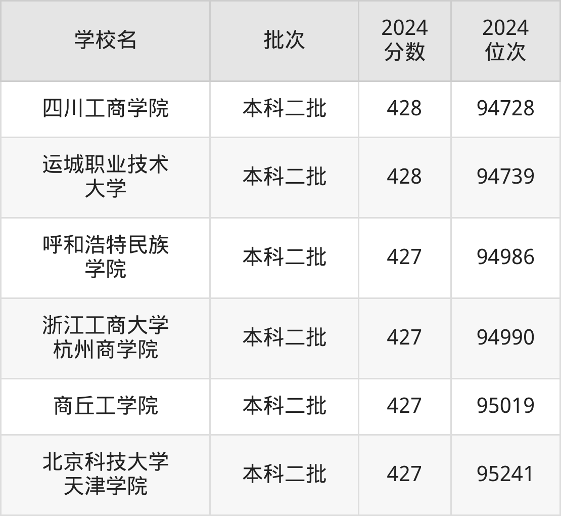 2024年陕西高考理科428分(94074名~94788名)能上的大学有天津理工大学中环信息学院、山西应用科技学院、运城职业技术大学、沈阳医学院等。