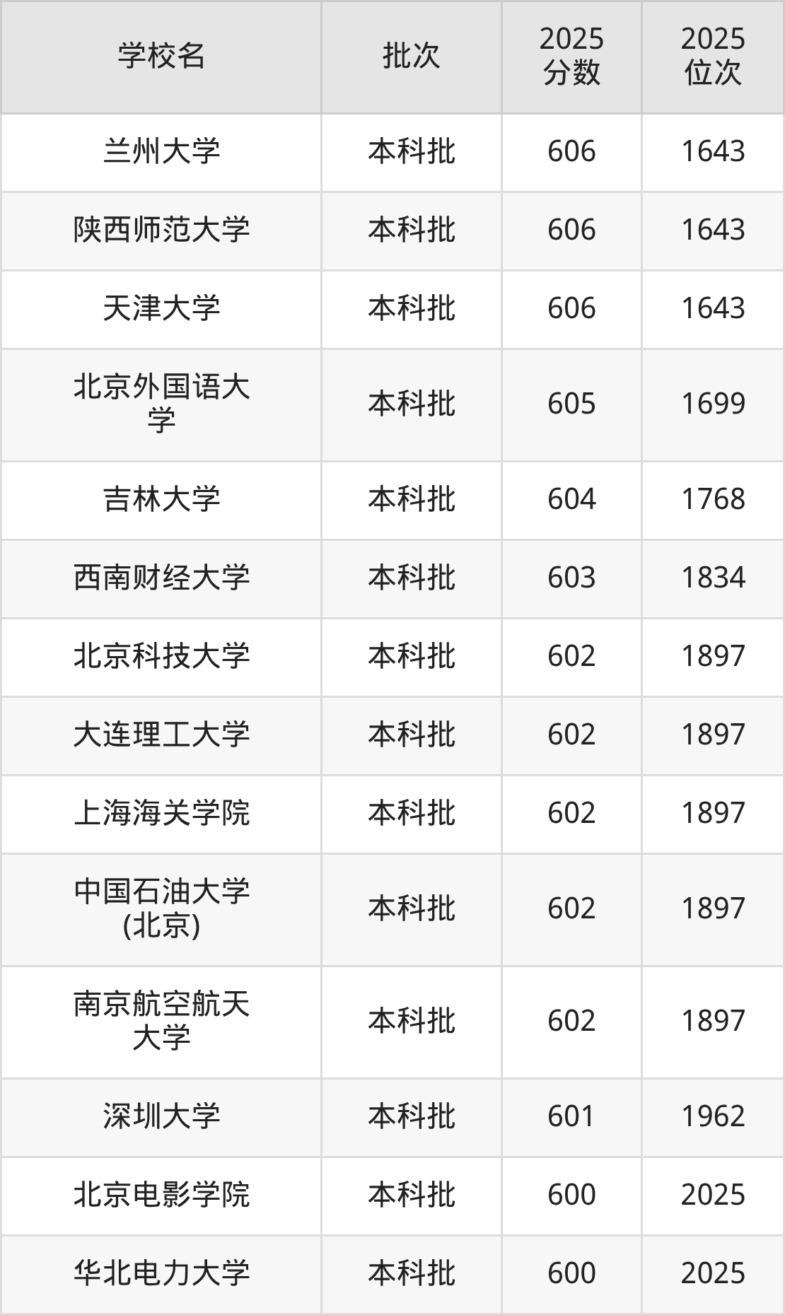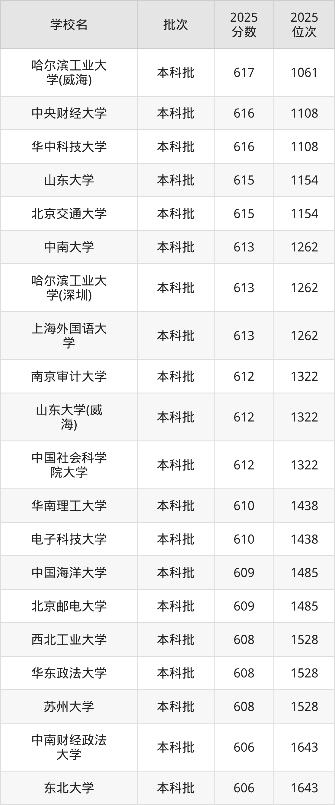 由于高考录取分数线历年波动较大,因此本文以该分数对应的位次排名为大家整理能上的大学名单。