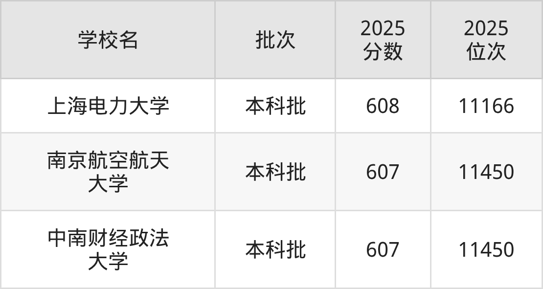 2025年辽宁高考物理类607分(11167名~11450名)能上的大学有南京航空航天大学、中南财经政法大学。