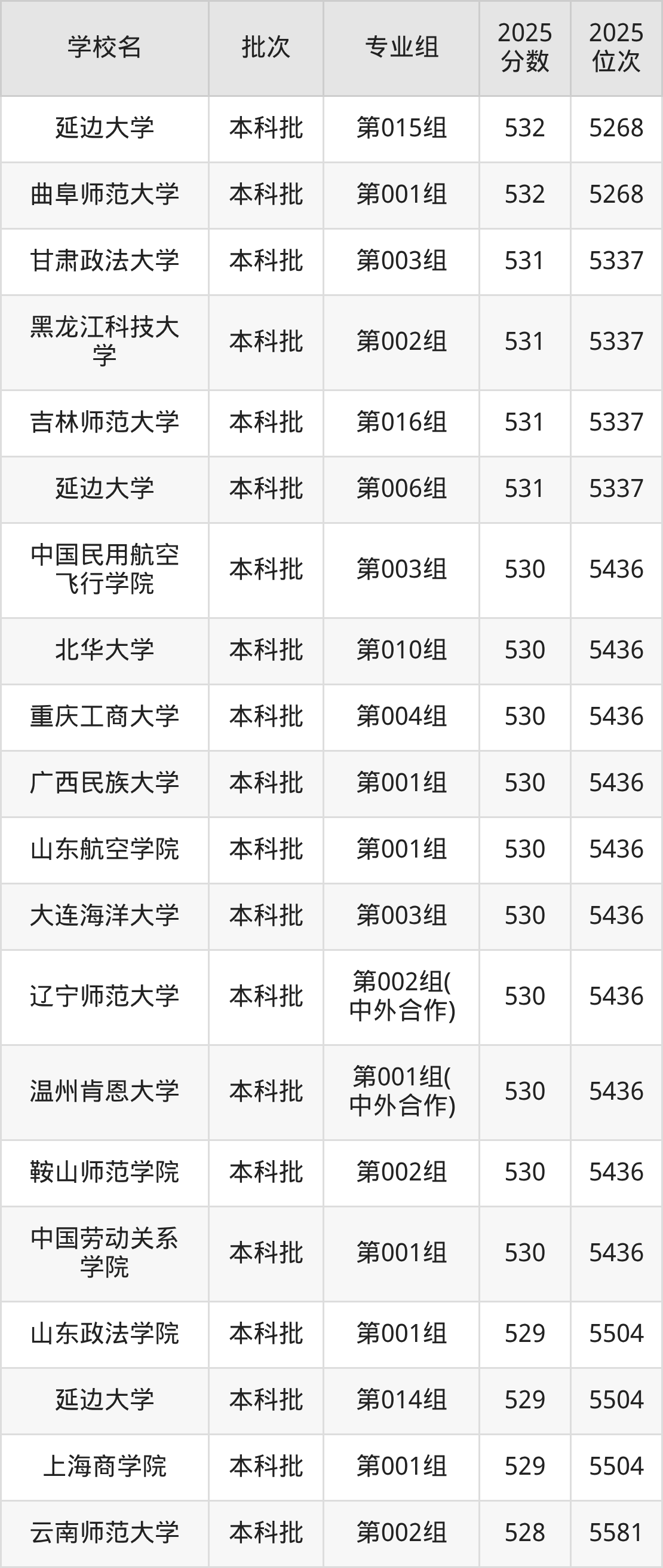 2025年吉林高考历史类529分(5437名~5504名)能上的大学有延边大学第014组、上海商学院第001组、山东政法学院第001组。