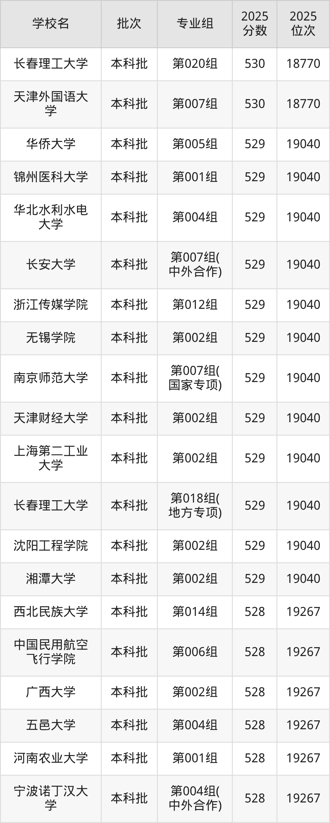 另外录取位次低于该区间(较稳妥)的有中国民用航空飞行学院第006组(19267名)、大连医科大学第003组(19267名)等;录取位次高于该区间(可冲)的有天津外国语大学第007组(18770名)、长春理工大学第020组(18770名)等。