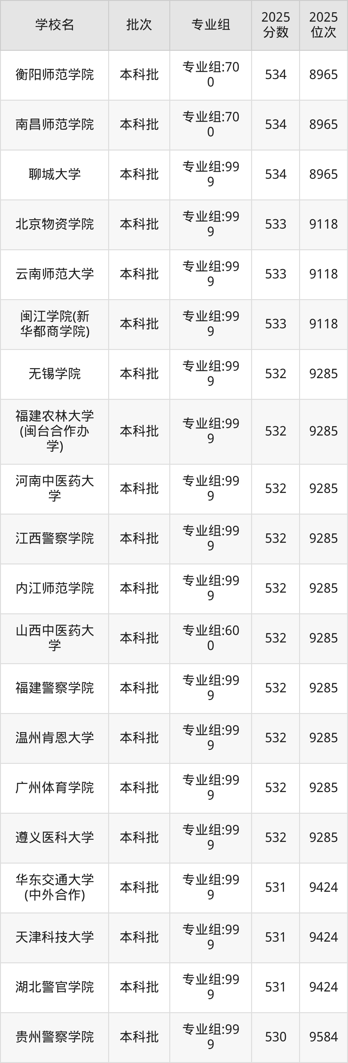 2025年福建高考历史类533分(8966名~9118名)能上的大学有闽江学院(新华都商学院)专业组:999、北京物资学院专业组:999、云南师范大学专业组:999。