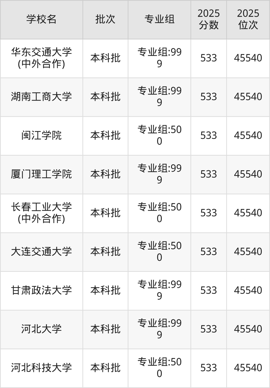2025年福建高考物理类533分(44919名~45540名)能上的大学有闽江学院专业组:500、厦门理工学院专业组:999、长春工业大学(中外合作)专业组:500、大连交通大学专业组:500等。