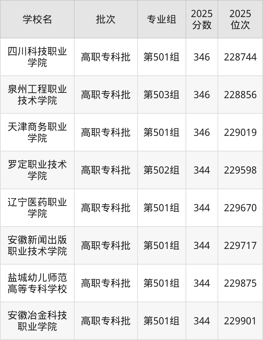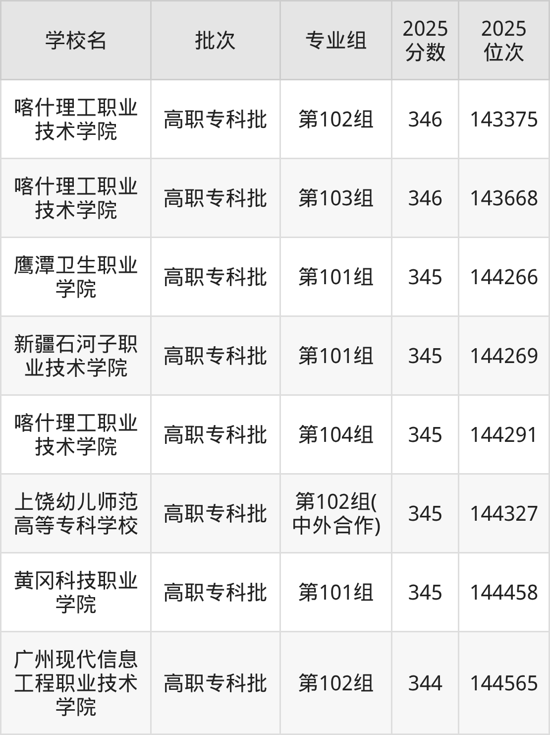 2025年江西高考历史类345分(143705名~144461名)能上的大学有喀什理工职业技术学院第104组、新疆石河子职业技术学院第101组、黄冈科技职业学院第101组、上饶幼儿师范高等专科学校第102组(中外合作)等。