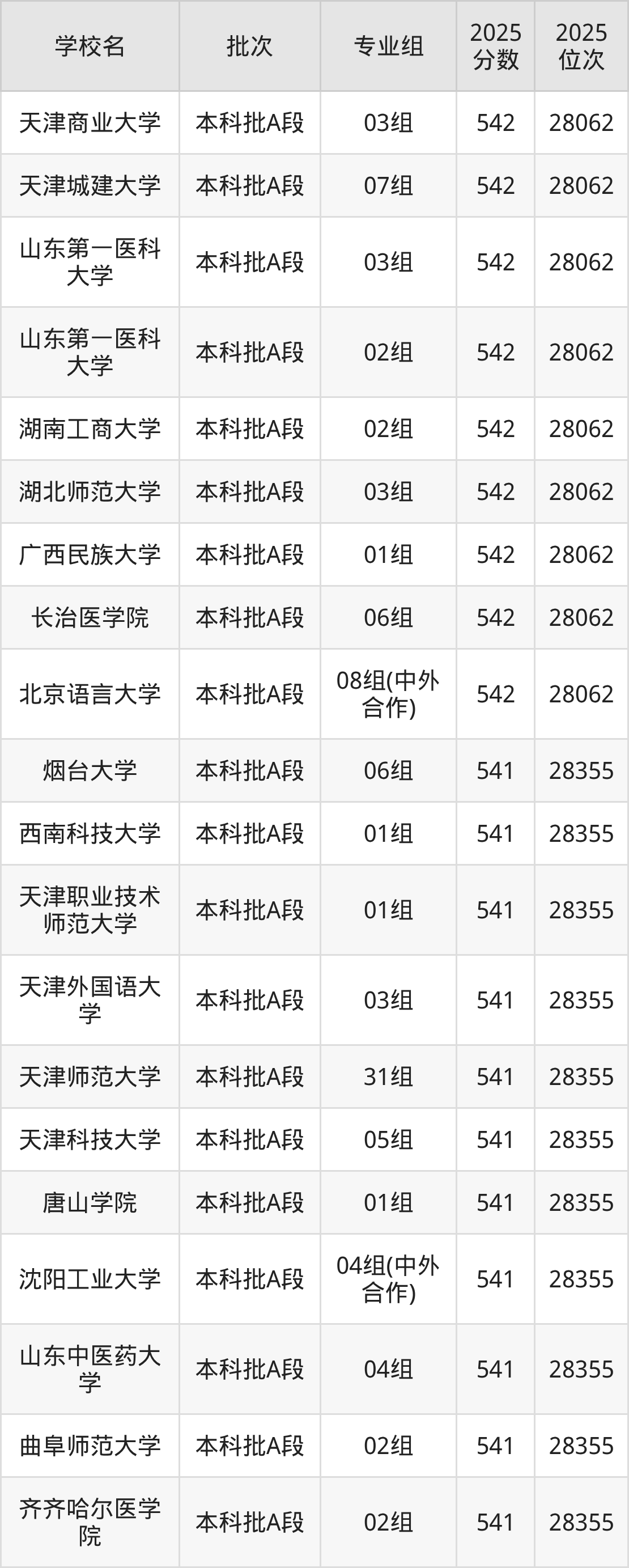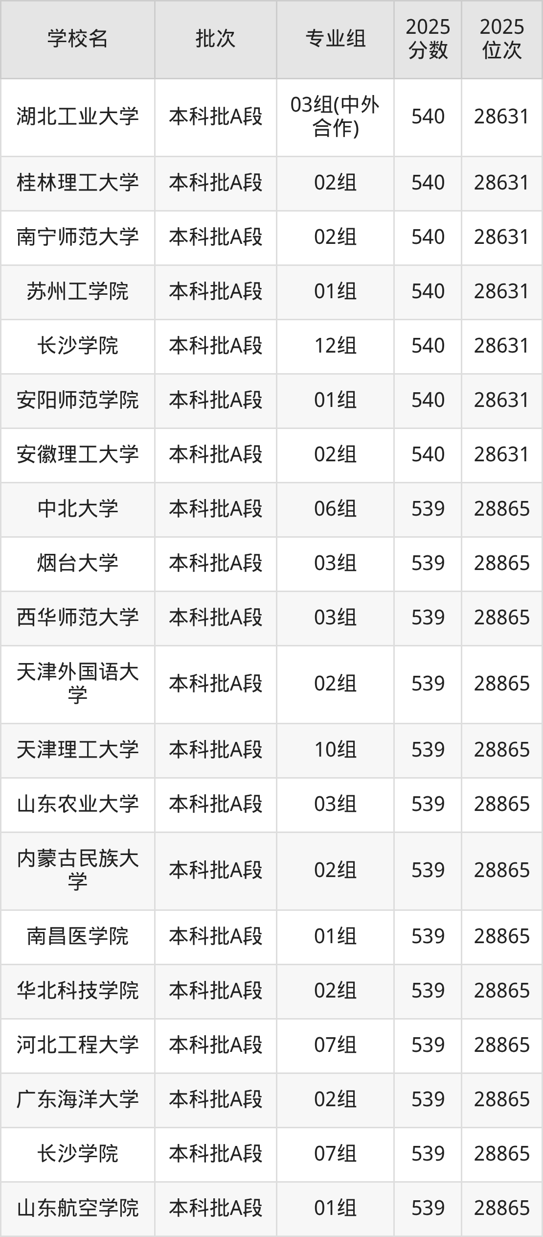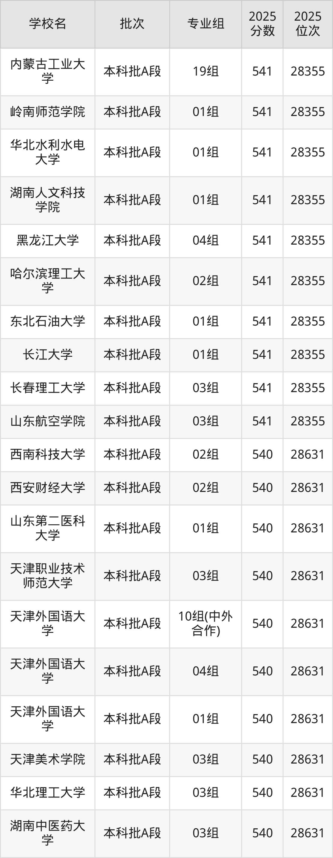 2025年天津高考540分(28356名~28631名)能上的大学有安徽理工大学02组、安阳师范学院01组、长沙学院12组、苏州工学院01组等。