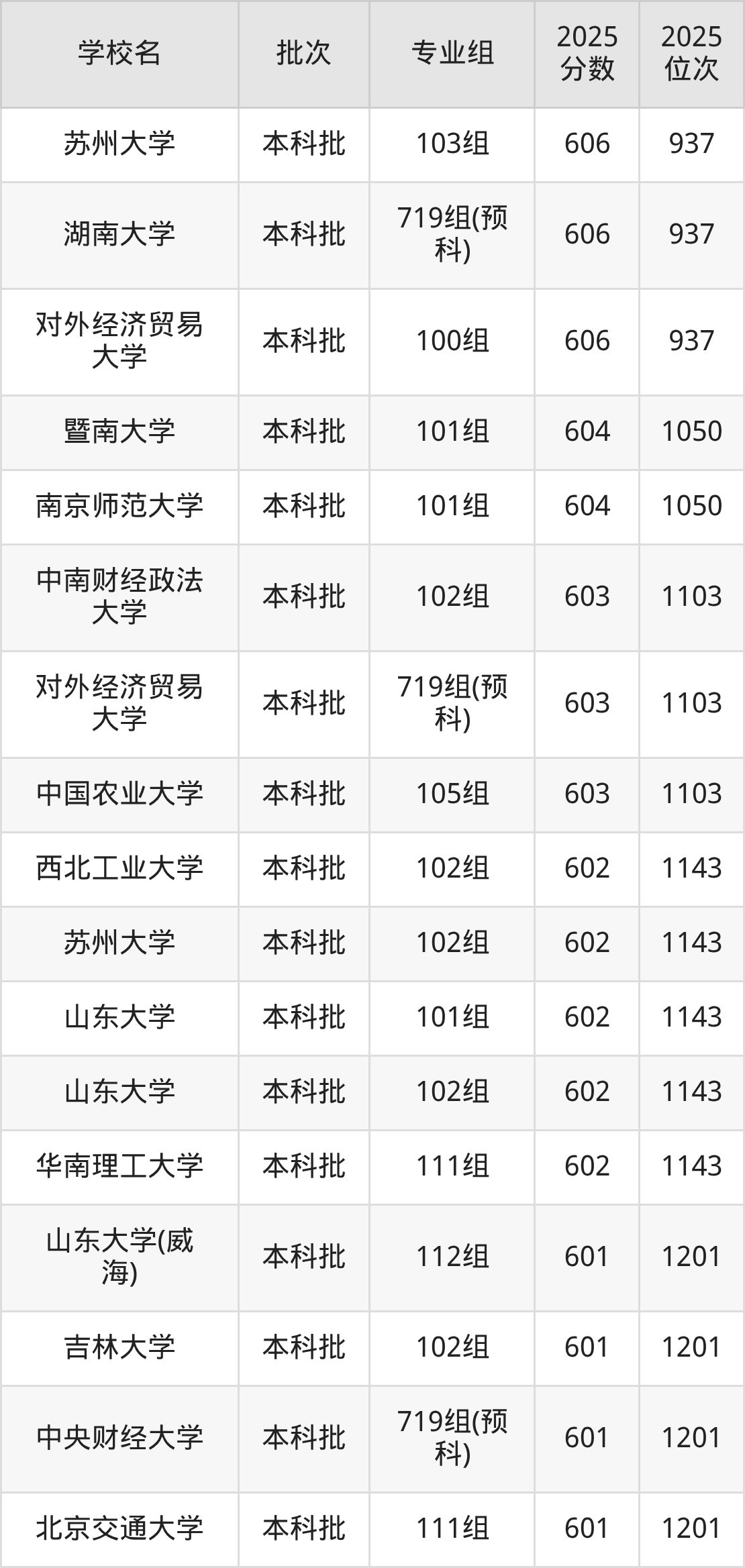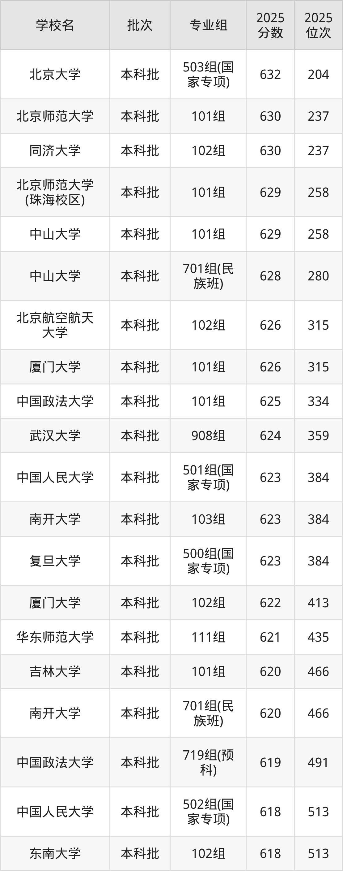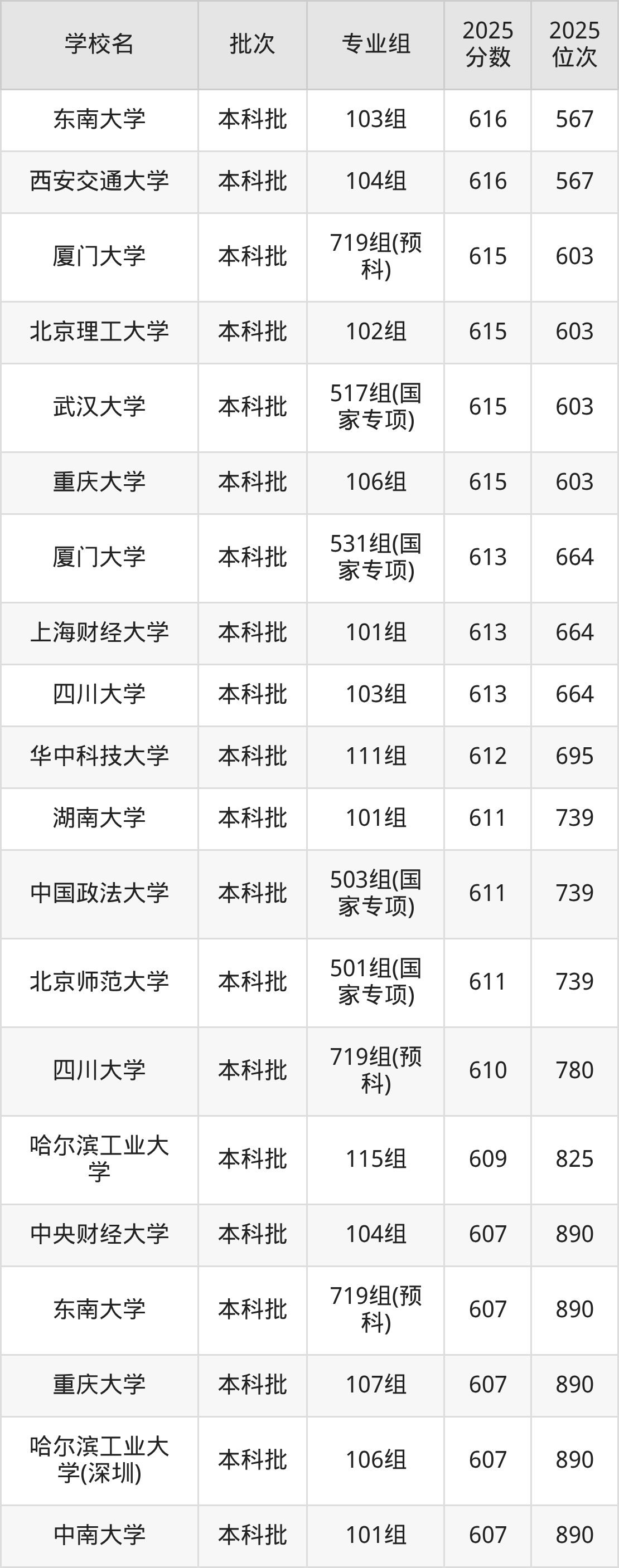 2025年广西高考历史类611分(696名~739名)能上的大学有北京师范大学501组(国家专项)、中国政法大学503组(国家专项)、湖南大学101组。