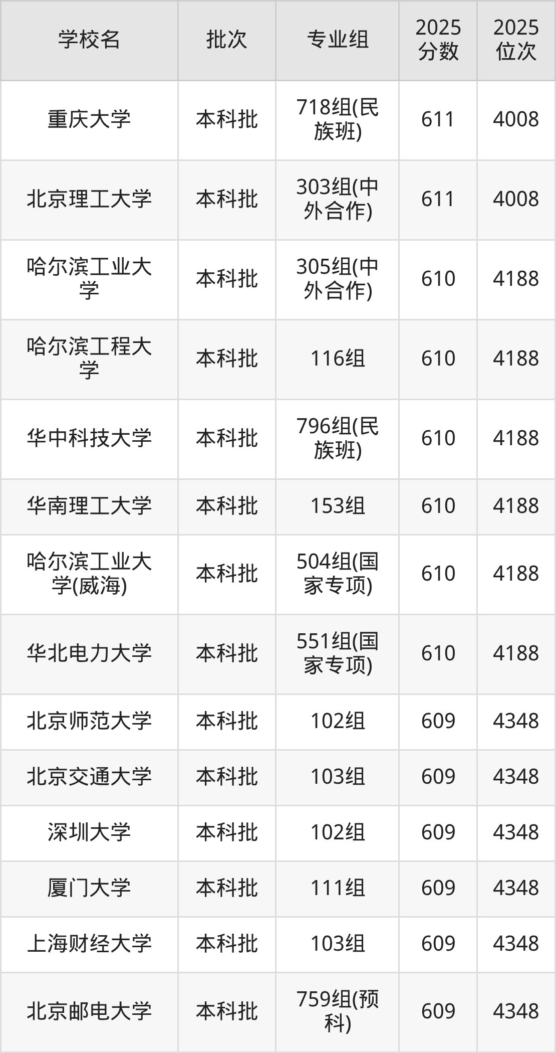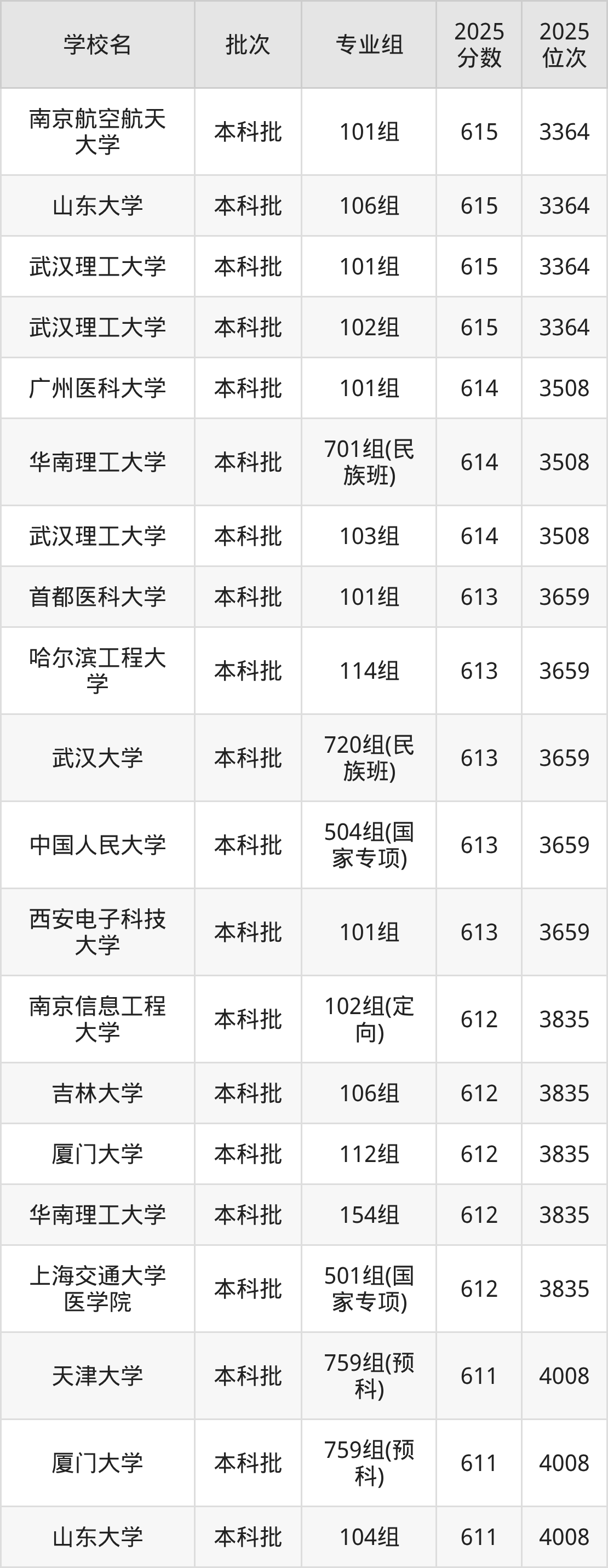 2025年广西高考物理类611分(3836名~4008名)能上的大学有北京理工大学303组(中外合作)、天津大学759组(预科)、厦门大学759组(预科)、山东大学104组等。