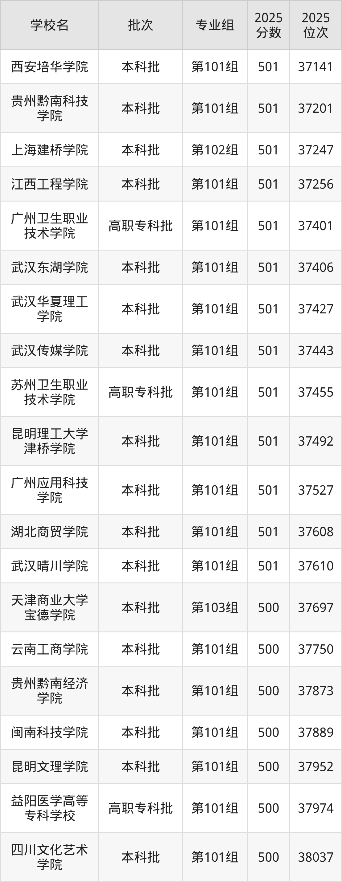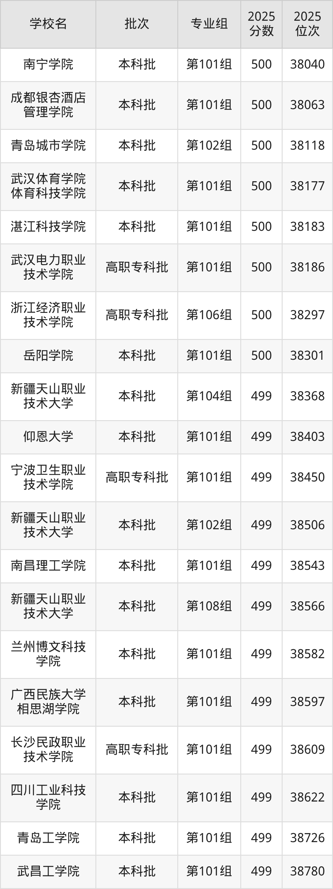 2025年江西高考历史类500分(37640名~38305名)能上的大学有天津商业大学宝德学院第103组、闽南科技学院第101组、青岛城市学院第102组、武汉体育学院体育科技学院第101组等。