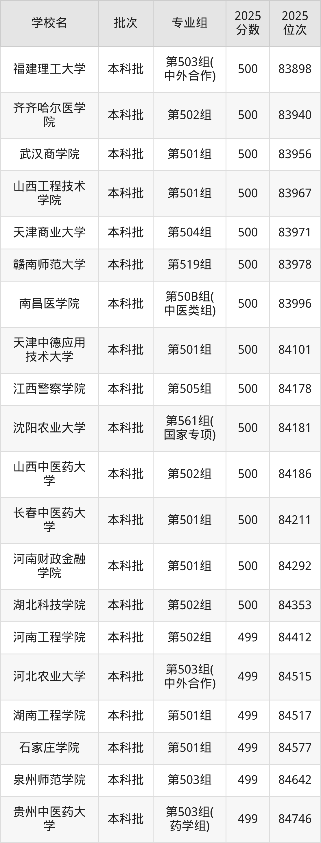2025年江西高考物理类500分(83106名~84381名)能上的大学有安徽师范大学第503组、沈阳农业大学第561组(国家专项)、哈尔滨医科大学第509组、天津商业大学第504组等。
