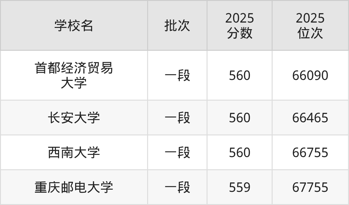 2025年山东高考560分(65980名~67397名)能上的大学有西南大学、首都经济贸易大学、长安大学。