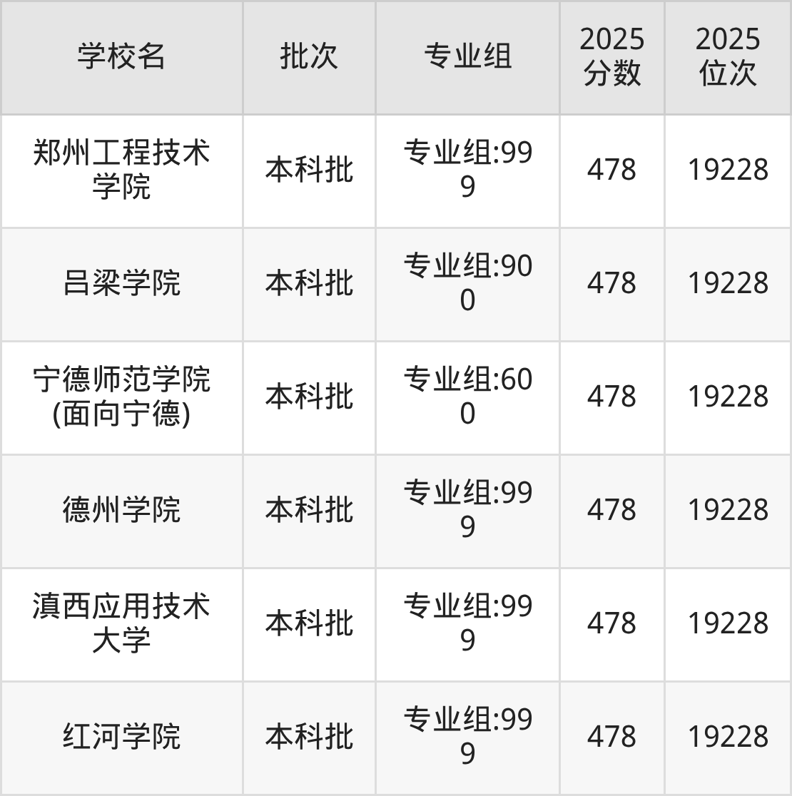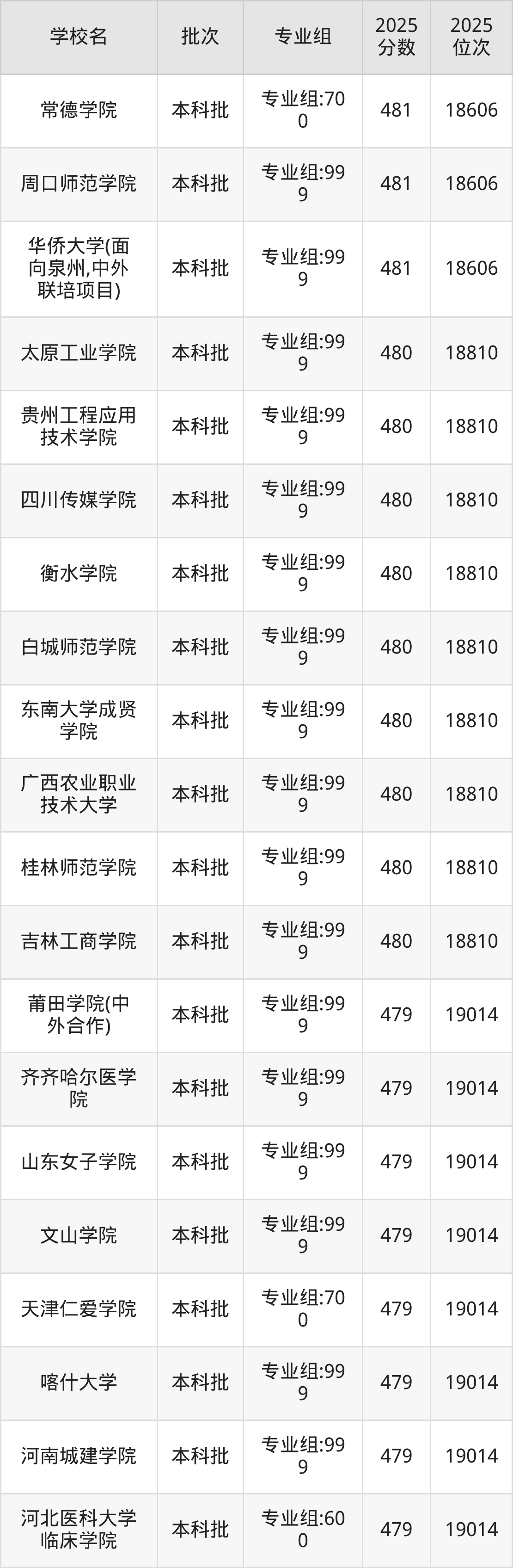 2025年福建高考历史类480分(18607名~18810名)能上的大学有白城师范学院专业组:999、东南大学成贤学院专业组:999、广西农业职业技术大学专业组:999、桂林师范学院专业组:999等。