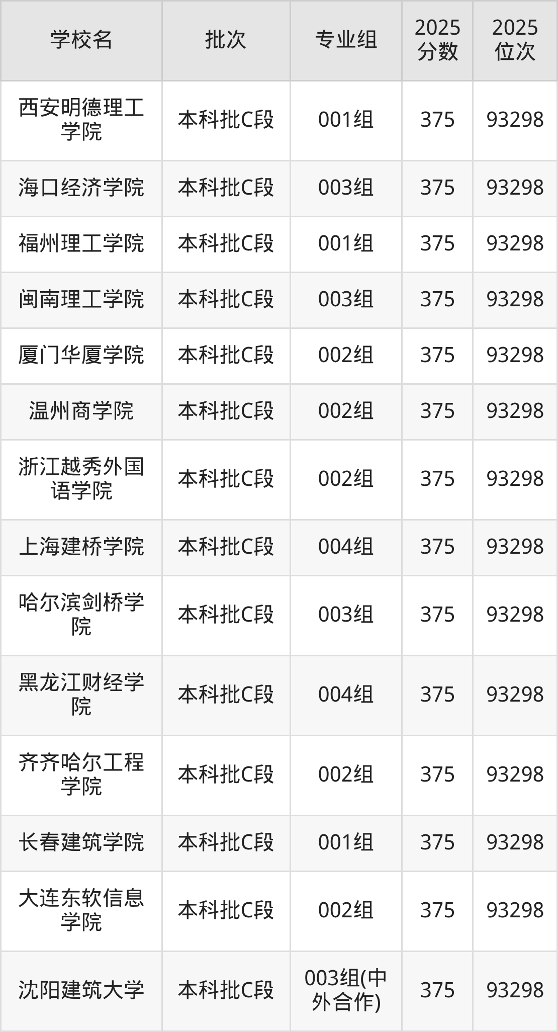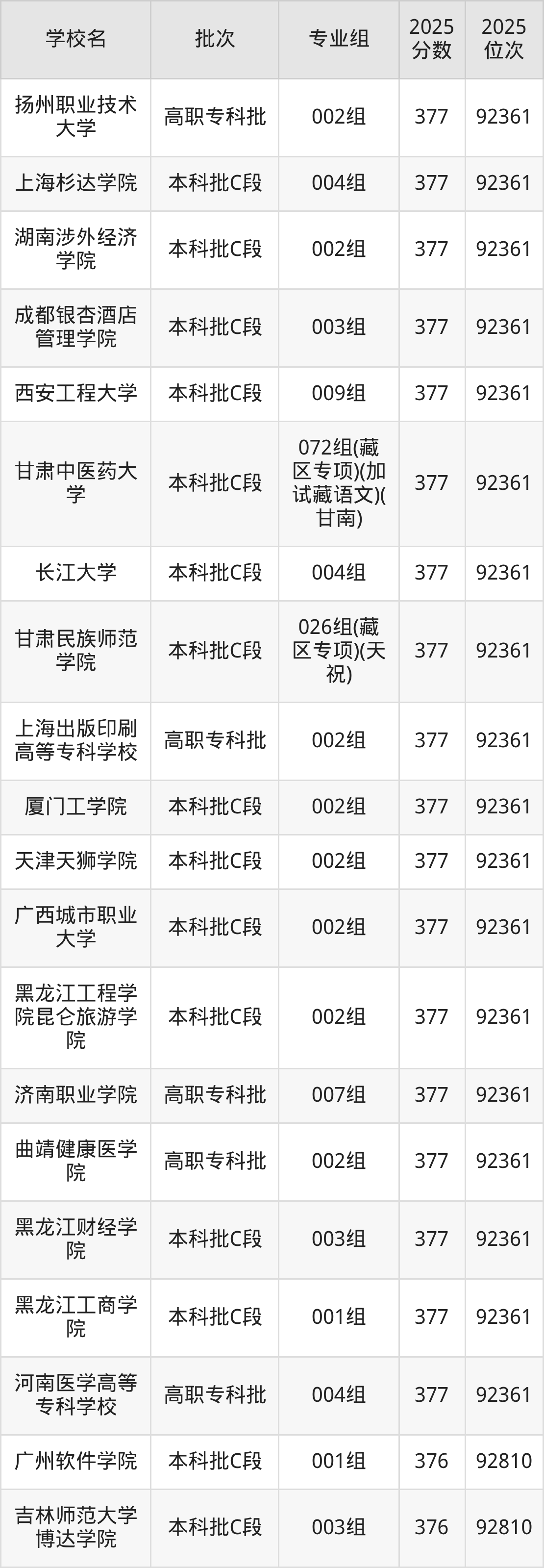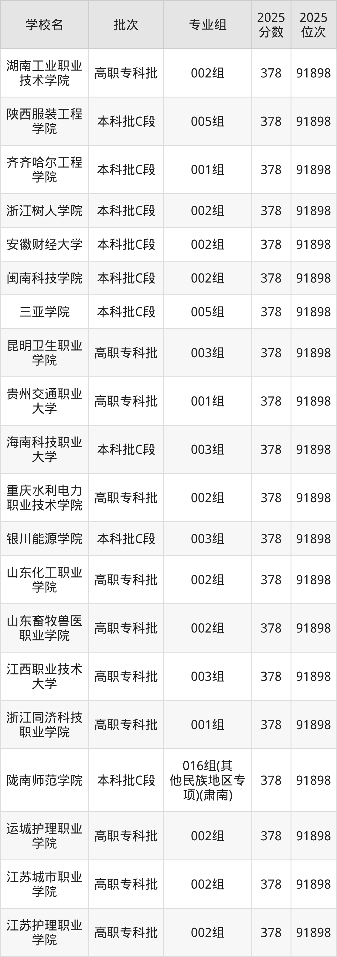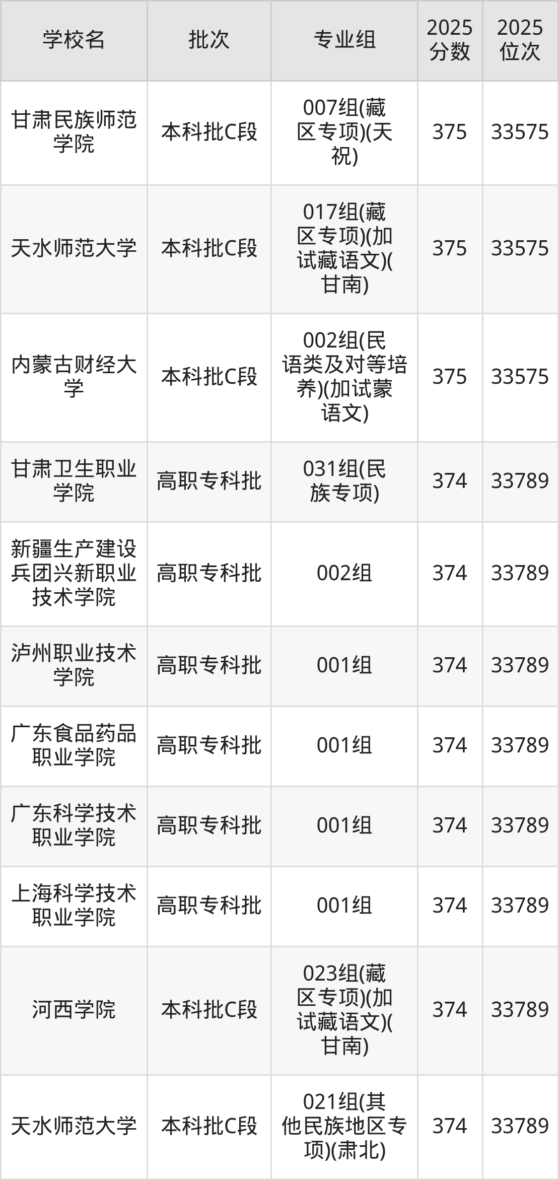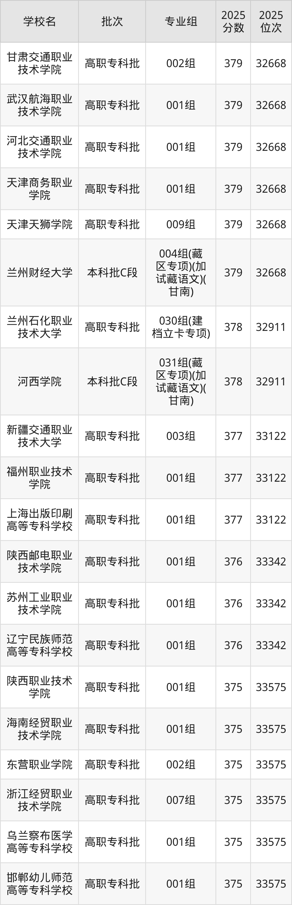 2025年甘肃高考历史类376分(33123名~33342名)能上的大学有辽宁民族师范高等专科学校001组、苏州工业职业技术学院001组、陕西邮电职业技术学院001组。